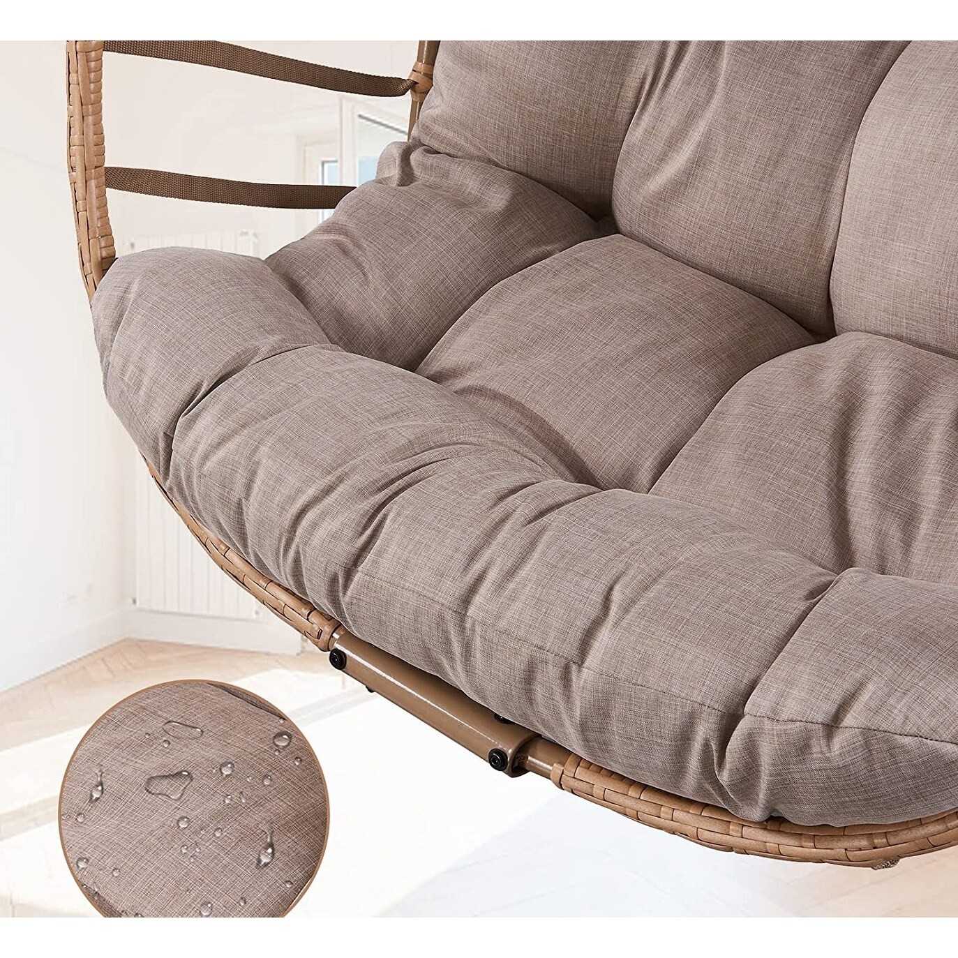 Material:Polyester, Rattan Stand Colour: Black Cushion Colour: Brown Egg Chair Size: 36.2"W x24 "D x45.2 "H Cushion Size: 43.5"W x5 "D x33.5 "H Head Cushion Size:17.5"W x 10"H Maximum Weight Recommendation:300 PoundsAbout this item Sturdy and ComfortableSeat and frame of egg chair is constructed of polyethylene rattan resin wicker wrapped around a iron frame for weather-resistant protection, strength and durability.Back features texling rope.Seat cushion and headrest pillow feature a polyester material and polyester fiberfill cores,sitting inside this patio egg chair will make you feel comfortable and relaxed. Large Size and Oversized CapacitySuper Large size basket chair:36.2"W x24 "D x45.2 "H;Weight Capacity 350 LBS.Gentle ergonomic curve support body perfectly,5 inches thick Free Shipping Over $49.99* Details Outdoor Wicker Egg Hanging Basket Swing Chair Product Description: Material:Polyester, Rattan Stand ColourBlack Cushion ColourBrown Egg Chair Size36.2"W x24 "D x45.2 "H Cushion Size43.5"W x5 "D x33.5 "H Head Cushion Size:17.5"W x 10"H Maximum Weight Recommendation:300 Pounds About this item Sturdy and ComfortableSeat and frame of egg chair is constructed of polyethylene rattan resin wicker wrapped around a iron frame for weather-resistant protection, strength and durability.Back features texling rope.Seat cushion and headrest pillow feature a polyester material and polyester fiberfill cores,sitting inside this patio egg chair will make you feel comfortable and relaxed. Large Size and Oversized CapacitySuper Large size basket chair:36.2"W x24 "D x45.2 "H;Weight Capacity 350 LBS.Gentle ergonomic curve support body perfectly,5 inches thick Premium Fluffy Cushion and headrest pillow giving you maximum comfort to lounge about. Vertical FoldableThis wicker hanging chair has a unique design.When you don't use it,you can fold it up just by loosening the two screws on the top and bottom, which can greatly save your space. Indoor/OutdoorThe hanging egg chair with stand suitable for indoor and outdoor,wonderful addition to patio,deck,garden,yard,backyard,porch,bedroom,living room.The teardrop chair is also a great choice as a gift to your family and friends. Packing List: 1×Egg Chair 1 x Stand 1×Seat Cushion 1×Head Cushion 1×Hanging Chain 1×Hardware Kit