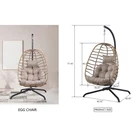 Material:Polyester, Rattan Stand Colour: Black Cushion Colour: Brown Egg Chair Size: 36.2"W x24 "D x45.2 "H Cushion Size: 43.5"W x5 "D x33.5 "H Head Cushion Size:17.5"W x 10"H Maximum Weight Recommendation:300 PoundsAbout this item Sturdy and ComfortableSeat and frame of egg chair is constructed of polyethylene rattan resin wicker wrapped around a iron frame for weather-resistant protection, strength and durability.Back features texling rope.Seat cushion and headrest pillow feature a polyester material and polyester fiberfill cores,sitting inside this patio egg chair will make you feel comfortable and relaxed. Large Size and Oversized CapacitySuper Large size basket chair:36.2"W x24 "D x45.2 "H;Weight Capacity 350 LBS.Gentle ergonomic curve support body perfectly,5 inches thick Free Shipping Over $49.99* Details Outdoor Wicker Egg Hanging Basket Swing Chair Product Description: Material:Polyester, Rattan Stand ColourBlack Cushion ColourBrown Egg Chair Size36.2"W x24 "D x45.2 "H Cushion Size43.5"W x5 "D x33.5 "H Head Cushion Size:17.5"W x 10"H Maximum Weight Recommendation:300 Pounds About this item Sturdy and ComfortableSeat and frame of egg chair is constructed of polyethylene rattan resin wicker wrapped around a iron frame for weather-resistant protection, strength and durability.Back features texling rope.Seat cushion and headrest pillow feature a polyester material and polyester fiberfill cores,sitting inside this patio egg chair will make you feel comfortable and relaxed. Large Size and Oversized CapacitySuper Large size basket chair:36.2"W x24 "D x45.2 "H;Weight Capacity 350 LBS.Gentle ergonomic curve support body perfectly,5 inches thick Premium Fluffy Cushion and headrest pillow giving you maximum comfort to lounge about. Vertical FoldableThis wicker hanging chair has a unique design.When you don't use it,you can fold it up just by loosening the two screws on the top and bottom, which can greatly save your space. Indoor/OutdoorThe hanging egg chair with stand suitable for indoor and outdoor,wonderful addition to patio,deck,garden,yard,backyard,porch,bedroom,living room.The teardrop chair is also a great choice as a gift to your family and friends. Packing List: 1×Egg Chair 1 x Stand 1×Seat Cushion 1×Head Cushion 1×Hanging Chain 1×Hardware Kit