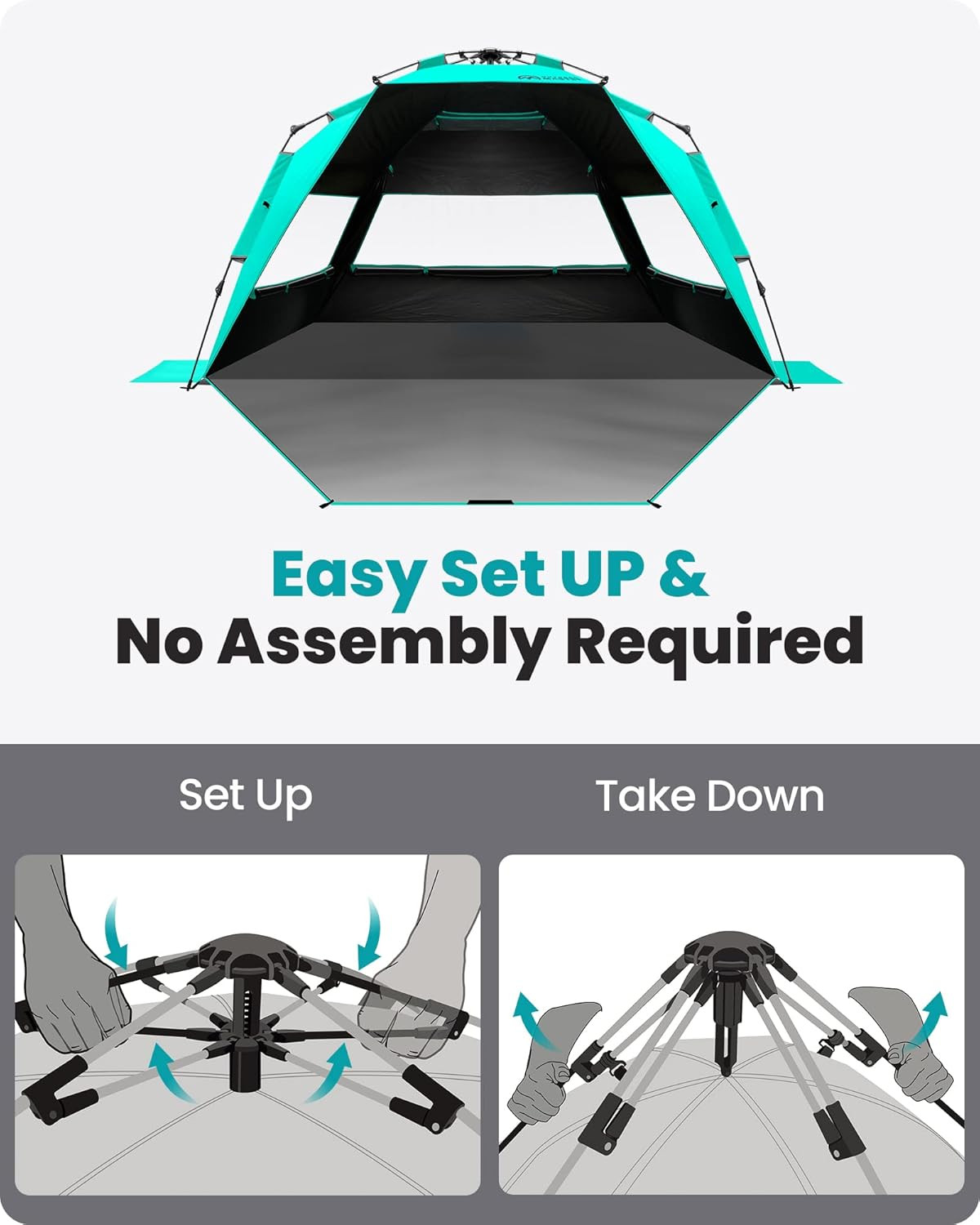 OutdoorMaster Beach Tent with Blackout Shelter Technology, Portable Green Product Details Brand: OutdoorMaster Material: 190T Spring Asia Textile Color: Green Item Weight: 8.5 Pounds Recommended Uses For Product: Beach, Camping & Other Outdoor Activities Product Dimensions: 94.4"L x 55.1"W x 53.1"H Ultraviolet Light Protection: BLOCKING 99.95% OF UVA and UVB RAYS (UPF 50+), ELIMINATES 95% SUNLIGHT Frame Material: Alloy Steel Closure Type: Zipper Water Resistance Level: Waterproof Pole Material Type: Metal Coverage: Waterproof 190T Spring Asia Textile with Blackout Shelter Technology and UV Protection Number of Guylines: 4 Assembly Required: No Item Package Dimensions L x W x H: 39.1 x 9.5 x 8.3 inches Package Weight: 4.45 Kilograms Item Dimensions LxWxH: 94.4 x 55 x 53 inches Brand Name: OutdoorMaster Model Name: beach tent Manufacturer: OutdoorMaster Part Number: 803838 Style: Portable Brand: OutdoorMaster Material: 190T Spring Asia Textile Color: Green Item Weight: 8.5 Pounds Recommended Uses For Product: Beach, Camping & Other Outdoor Activities Blackout Shelter Technology: Our Instant Shade Blackout Shelter is different from others on the market as it not only blocking 99.95% of UVA and UVB rays (UPF 50+), also eliminates 95% sunlight to protect your skin and objects for a more comfortable rest anytime of day 9.5MM Thickened Rods & 190T Material: We increased the thickness of the rods from 8.0mm (market standard) to 9.5MM and made with 190T Spring Asia Textile, this beach tent sun shelter is more rugged than other lower ones thus handle the wind firmly and stable without breaking or tearing Spacious Interior For 4 Person Tent: With the dimension of 94.4 x 55.1 x 53.1 inch, OutdoorMaster beach tent pop up shade enough room in the XL beach tent for 2 adults and 2 kids to sit in the inside. Ideal for family car camping or camping site Versatile Design: Our tent for beach built-in zippered door offers privacy to change into dry clothes. The extended front floor provides extra room for more activities. overhead Mesh pockets make it possible to store valuables Ventilation & Visibility: The pop up sun shade with ample mesh panels allow views and enhances cross-ventilation to help manage condensation. The beach tents sun shelter 4-5 person has 1 large mesh door, 3 large screen panels, which boost the airflow and keep the bugs out Portable & Easy To Carry: This sun beach tent attached 4 sand pockets, comes with 4 Iron stakes, 8 plastic stakes & 4 guy lines strings to support extra stability, completely portable once set up with the carry bag