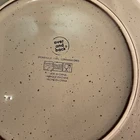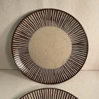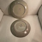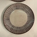 The Over And Back Stoneware Salad/Dessert Plates are a set of two round plates with an 8.5" diameter, featuring a beige and brown lined pattern in an Art Deco style. Made of stoneware, these plates are microwave and dishwasher safe, making them suitable for all occasions. With a total weight of 2.3 lbs, they are a stylish addition to any table setting, combining functionality with an artistic touch from the 2000-2009 Art Pottery production style. Excellent condition. No chips or cracks.