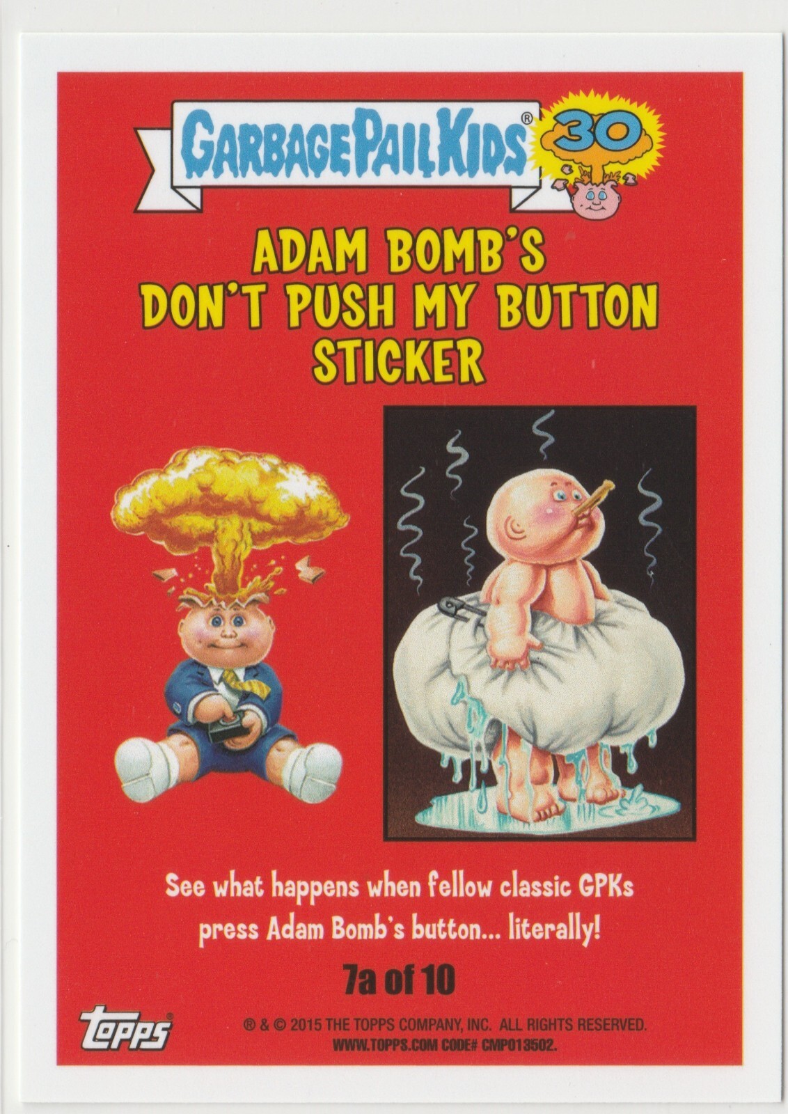 Over Flo #7a of 10 Topps Garbage Pail Kids GPK 2015 30th Anniversary Series Adam Bomb's Don't Push My Button Sticker subset personal stock photos centering of card may vary compared to listed images
