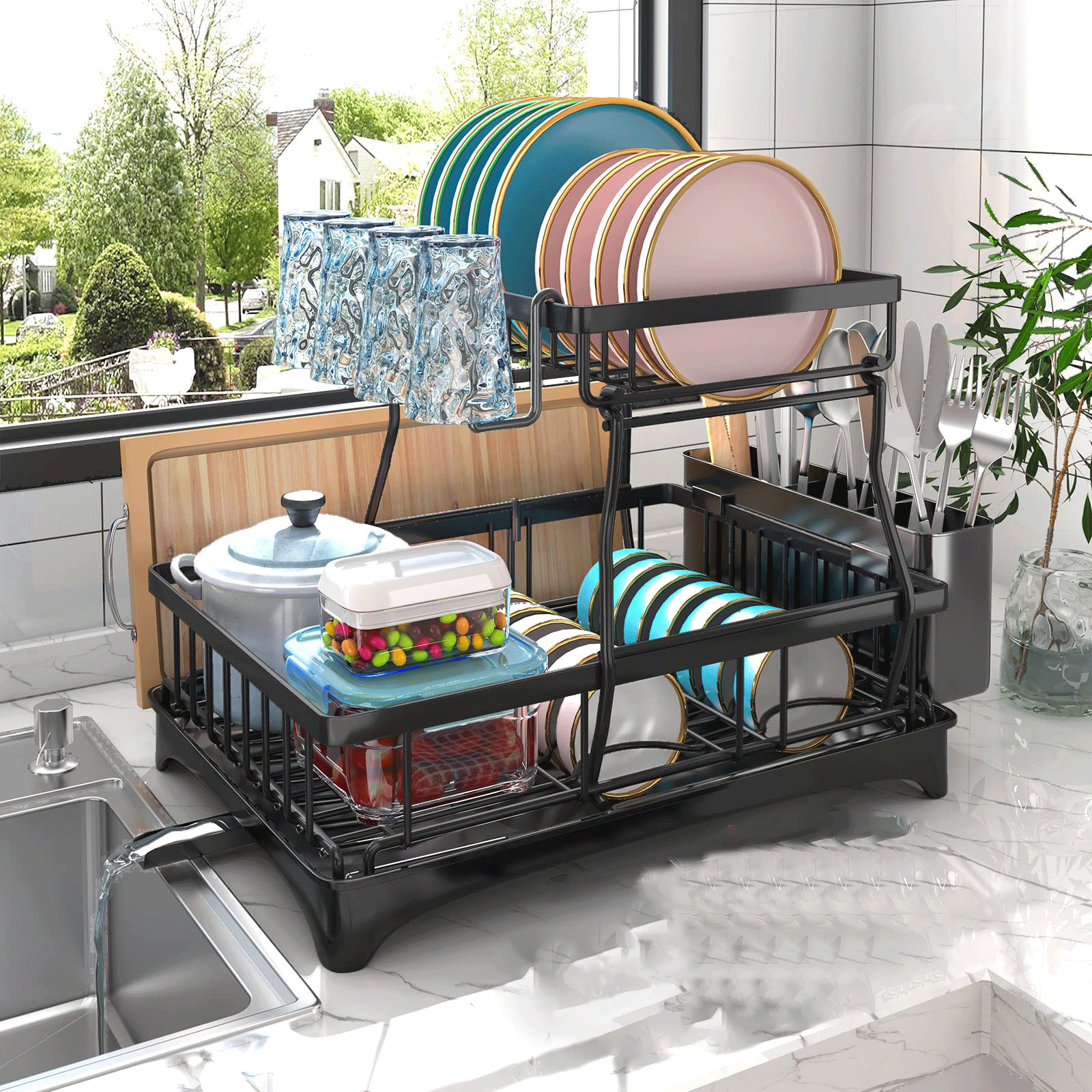 Over Sink Dish Drying Rack 2-Tier Stainless Steel Kitchen Shelf Cutlery Drainer Features: Optimize Space, Organize Life - Reclaim your kitchen counter real estate with the 2 Tier Dish Drying Rack! This space-saving wonder accommodates plates, dishes, cups, utensils, and even small pots with its two-tier design. The ideal solution for families of 2-4 seeking daily orderliness. Excess Water? Not Anymore! - Embrace immaculate countertops with the upgraded drainage system. The grooved drainboard collects water, while the 360° rotatable, retractable drain spout directs it away. An added switch eliminates any old leakage woes. Small Triangle, Big Impact - Carve out extra drying room in your sink's corner. Versatile and foldable, this triangular rack accommodates dishes and ensures proper ventilation. Crafted from food-grade materials, it's a must-have for any kitchen. Built for Endurance, Designed for Delight - This Dish Rack is your ultimate kitchen ally. Its classic coating battles rust and corrosion, while its robust load-bearing capacity stands up to daily demands. Your tableware is safe from scratches, thanks to rounded edges. Swift Setup, Seamless Versatility - Elevate your kitchen routine effortlessly. Assemble without tools or screws. The detachable top rack serves the sink, while the bottom rack takes on the counter. Streamline your kitchen operations with ease and efficiency. Specifications: Brand: NewHome Product Type: Dish Drying Rack Color: Black Material: Carbon Steel, ABS Load Bearing: 15kg/33lbs Capacity: 20 x Bowls + 10 x Dishes + 4 x Cups + 10Pairs x Chopsticks + 5 x Knives + 8 x Utensils Tray Size: 42x30x4.5cm/16.54x11.81x1.77in Item Size: 48x31x33cm/18.9x12.2x13in (L x W x H) Item Weight: 2kg/4.41lbs Package Size: 43.5x31.5x12cm/17.13x12.4x4.72in Package Weight: 2.4kg/5.29lbs Package Contents: 1 x Dish Drying Rack 1 x User Manual Payment Shipping Return Contact us About us Payment 1.Paypal, Credit Card, G Pay etc, many payment way is accepted. 2.Please be sure your shipping address is correct before make a payment. Shipping 1.We are shipping from multiple warehouses (Houston, Texas/ Corona, California) , please note before placing an order 2.We will ship out the item within 1-3 business days after comfirming the payment, appreciate your patience. 3.If the items are broken on the way( we will check the orders clearly before we sent them ),please contact us in 3 days you received it. We will send you a new one or refund your payment. Return 1.We stand behind every buyer.Items can be returned for exchange or refund within 30 days. 2.Please contact us when you have any confusion of our item, we will solve the trouble for you as soon as possible. Contact us 1.This is professional Seller.We will reply your message within 24 hours. 2.Please contact us whenever you have any question about the item. We will deal with it as soon as possible. 3. If you are unhappy with the item or our service,please Contact Us before leave feedback,just give me a chance,thank you! About us 1. Unless specified otherwise, all our products are IN STOCK and are shipped from Local warehouse - Not Overseas! 2. We provide a 30 day Satisfaction Guarantee or your money back (provided items are in the same new and resaleable condition.) 3. We have a PayPal Verified Business Account, please buy with Confidence! 4. Every item will be tesrted before send.We know our products well and if we don't have the answers we will do our best to find them for you! 5. Our friendly team look forward to serving you! Your satisfaction is our No.1 Priority We will do our best to satisfacy you.