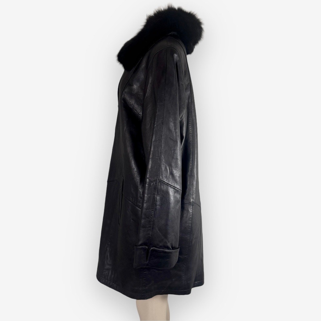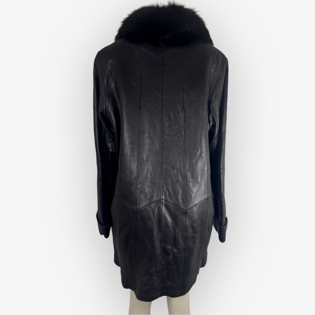 Preowned, Excellent Used Condition Light wear from Previous Wear, see last Picture Beautiful Genuine Black Leather Coat with Black Fur collar Removable Collar and Thinsulate Liner Very Soft Fur (Unknown Fur Material) Measurements Laying Flat (inches) Pit to Pit 22" Length (Shoulder to Hem) 35" Color May vary from what is displayed on your screen, due to resolution and lighting