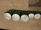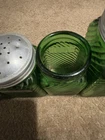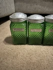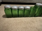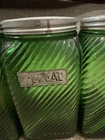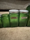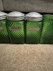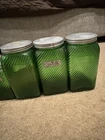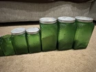 Owen’s Illinois green Canister Set of 10. They have all been used, some have labels on them. Others, do have more wear and tear on them. Is missing a top to one of them (shown in pictures). Overall in good condition!!