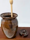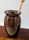 This beautiful honey jar is a perfect addition to your kitchen. Made in the United States in the 1980s by Owens Pottery, this piece is a contemporary original and showcases the Arts & Crafts/Mission Style. The jar is 5 1/2 inches in height and 4 1/2 inches in width, with a lovely brown/gray color and salt glaze finish. The set includes a lid with a hole for inserting the wooden scooper, and a wooden scooper. The honey jar is made of stoneware and is handmade with production technique of pottery. It has the features of a honey jar, lid, and wooden scooper, making it a perfect piece for serving honey. This vintage piece is a must-have for collectors and those who appreciate art pottery. A great piece from the Seagrove, NC Pottery Area.