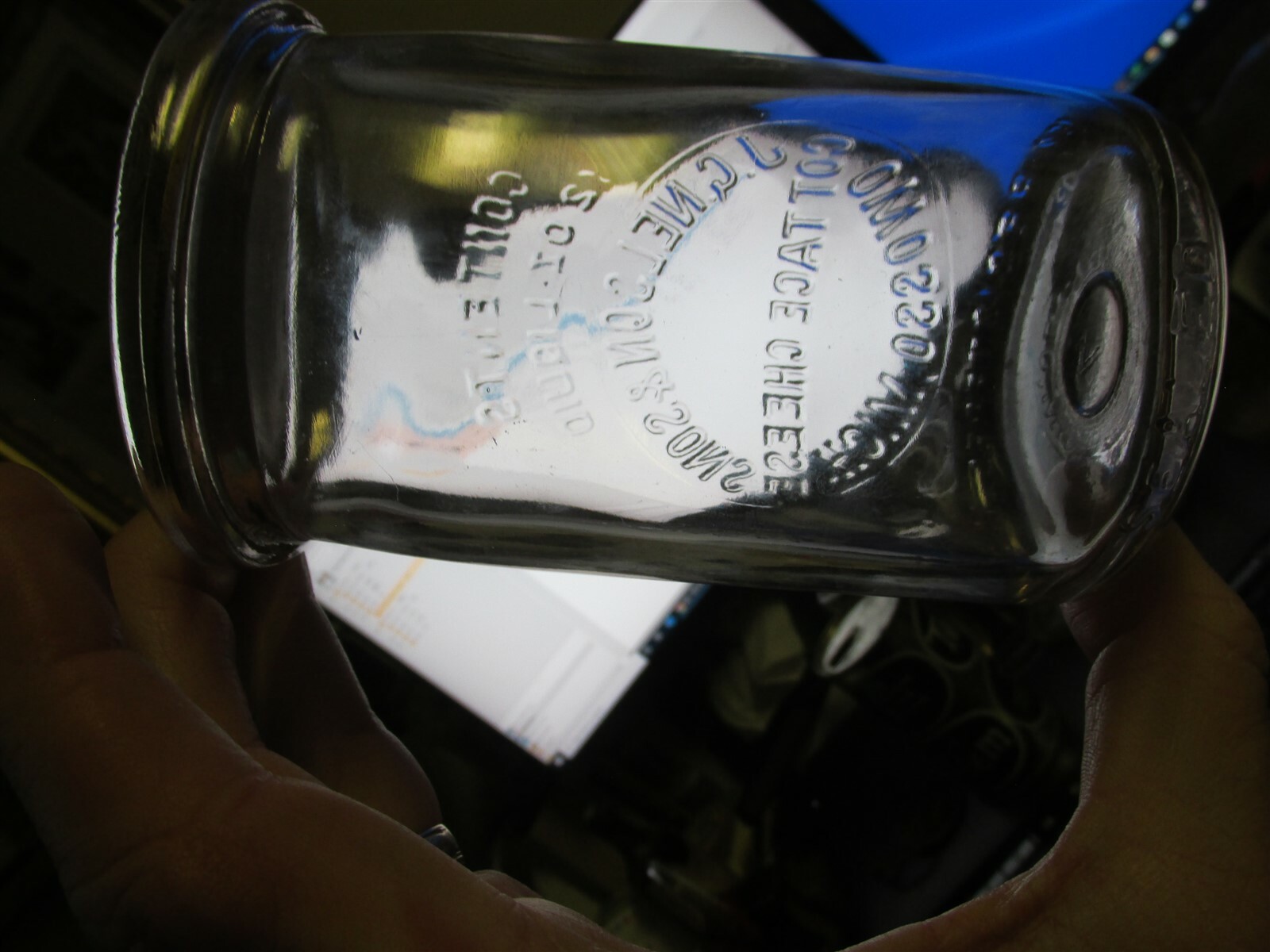 owoestfx10jds55 Here is a nice vintage round embossed 12 Ounce Cottage Cheese jar embossed in slug plate: J.G. Nelson & Sons / Cottage Cheese / Owosso, Mich. Complete with original Cottage Cheese lid. Condition: Mint, NO chips, cracks or dings. See pictures above. I grade this one a 9.5 to 10 on a scale of 1 to 10. Great for the collector of MICHIGAN MICH MI milk dairy cream creamer creamery cow farm bottle bottles. Email me if you would like more pictures or have any other questions. SEE MY OTHER LOTS OF BOTTLES AND GOOD ITEMS ON EBAY PRESENTLY. Email me if you would like more pictures or have any other questions. YES I DO COMBINE SHIPMENT OF ITEMS WON IN THE SAME WEEK IN ORDER TO SAVE YOU POSTAGE COSTS. I am a charter member of The National Association of Milk Bottle Collectors, publishers of the monthly publication: The Milk Route, as well as a member of the FEDERATION OF HISTORIC BOTTLE COLLECTORS (FOHBC), email me for information about joining these fine organizations.