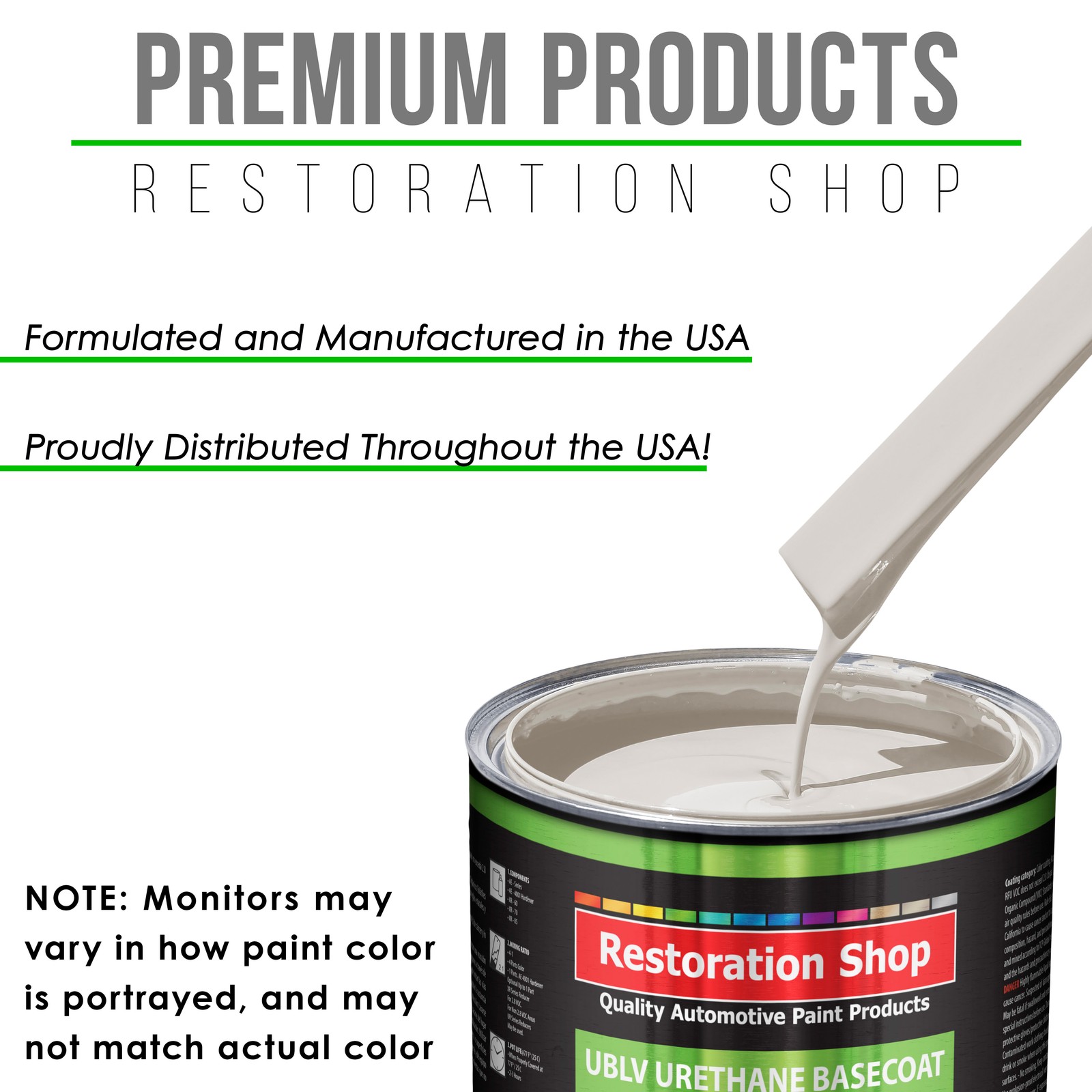 TCP Global Ebay Storefront Ordering | Shipping | Returns | International Product Information FLAMMABLE/HAZARDOUS ITEMS ARE SHIPPED VIA UPS GROUND/STANDARD TO THE LOWER 48 U.S. STATES & CANADA. ***SHIPPING VIA U.S. POSTAL SERVICE OR TO A P.O. BOX IS NOT AVAILABLE.*** RUSH AIR SHIPPING IS AVAILABLE IN CONTINENTAL U.S. FOR AN ADDITIONAL HAZMAT AIR SHIPPING CHARGE. CONTACT US PRIOR TO ORDERING FOR AIR SHIPPING QUOTE. IF ORDER IS PLACE FOR AIR SHIPPING YOU WILL BE CONTACTED FOR ADDITIONAL SHIPPING PAYMENT. INTERNATIONAL SHIPPING IS AVAILABLE. CONTACT US FOR SHIPPING QUOTE PRIOR TO ORDERING. Part# RSP UBLV1117-KIT-Q Oxford White - LOW VOC Urethane Basecoat with Clearcoat Auto Paint - Complete Medium Quart Paint Kit - Professional High Gloss Automotive Coating Complete 1 Quart Restoration Shop - Low 3.5 VOC Urethane Basecoat with Clearcoat Auto Paint Kit with Medium Drying Reducer (Used when the ambient temperature range is 70-85Á F). The kit provides 1-1/2 Quarts of sprayable basecoat color material and 1-1/4 Quarts of Premium Clearcoat. UBLV Paint Kit includes 1 Quart of UBLV Low VOC Urethane Basecoat Paint Color, 1 Quart of XR70 Exempt Medium Urethane Reducer, 1 Quart of RC4221 High-Gloss Urethane Clear, 1 Half-Pint of RH4201 Urethane Hardener and a 3 Pack of 190 Micron Nylon Automotive Strainers. The Restoration Shop (UBLV) Low VOC Urethane Basecoat and Premium Clearcoat System is a State-of-the-Art High-Performance Professional Easy-To-Use Paint Coating System that is Designed to Reproduce the Hi-Tech O.E.M. Automotive Finishes Found on Today's Vehicles. UBLV is an easy to spray fast-drying basecoat/clearcoat system that provides a long-lasting and very high gloss topcoat finish result. UBLV is an extremely durable, chemical and solvent resistant coating that also resists chipping, cracking, and UV ray fading. Restoration Shop's (UBLV) is a Low 3.5 VOC compliant basecoat/clearcoat paint system that may be used in National Rule or Low 3.5 VOC limit States when using it with the proper XR series reducers. Note: Monitors vary - onscreen colors are for general color reference only. Restoration Shop (UBLV) LOW VOC URETHANE BASECOAT with CLEARCOAT - COMPLETE MEDIUM QUART PAINT KIT Includes: 1 - Quart of Restoration Shop Low 3.5 VOC Premium Urethane Basecoat Auto Paint Color 1 - Quart of Medium (70-85¡ F) Exempt Urethane Reducer (RSP XR70-QT) 1 - Quart of High-Gloss Urethane Clear (RSP RC4221-QT) 1 - Half-Pint of Urethane Hardener (RSP RH4201-HP) 3 - Each Premium 190 Micron Nylon Automotive Strainers UBLV Paint Color has a 2 to 1 Mixing Ratio, 2 parts UBLV Paint Color to 1 part XR Urethane Reducer. UBVL Basecoat color requires a 2 to 1 mix ratio with the included medium drying (70-85¡ F) XR exempt urethane reducer before spraying. Restoration Shop High-Gloss Urethane Clear (RSP RC4221) has a 4 to 1 Mix Ratio, 4 parts Urethane Clearcoat to 1 part Urethane Hardener A 2.1 VOC conventional solid polyurethane clearcoat. A two-component (2K) polyurethane clearcoat formulated to offer ease of application, great flow and leveling, excellent durability and high-gloss. This high quality clearcoat is the prefered high production topcoat that professional's use in today's high-end auto body shops. This clearcoat is used for overall application, and is also used for spots and panels. The clearcoat is VOC compliant for all multi-stage topcoat systems, and can also be applied on top of other basecoat brands. Optional Reducers Available Separately XR Series Exempt Reducers to Maintain a 3.5 VOC Level: XR60 Exempt Fast Reducer 60-70¡ F; XR70 Exempt Medium Reducer 70-85¡ F; XR85 Exempt Slow Reducer 85¡ F and above Since 1974, Restoration Shop has been a Trusted Top Quality Brand and The Source for Innovative Premium Quality Automotive Products! Restoration Shop Low VOC UB Urethane Basecoat is a state-of-the-art basecoat designed to reproduce the hi-tech O.E.M. finishes found on today's vehicles. It features outstanding coverage, rapid dry time, excellent metallic control and optimum repairability. UBLV provides an environmentally friendly solvent solution. View all categories Warehouse Locations San Diego, California South Carolina