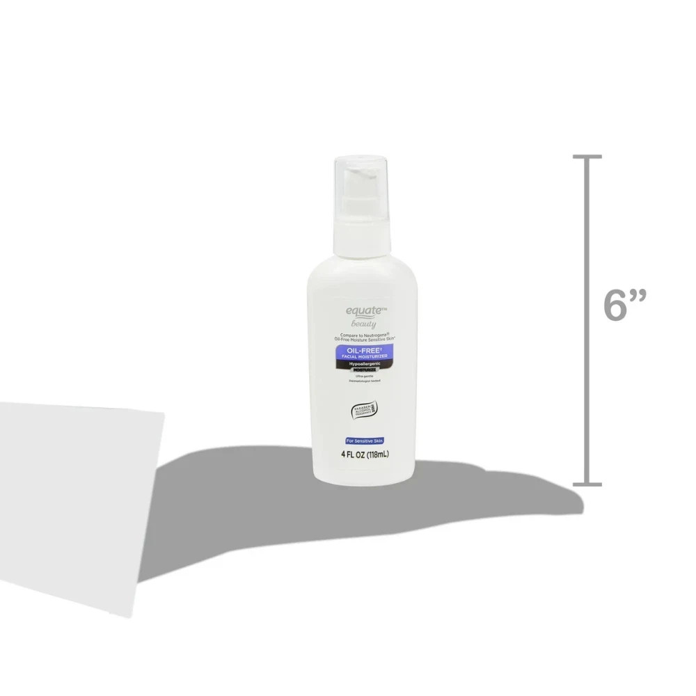 Equate Oil-Free Facial Moisturizer for Face Care of Sensitive Skin, Fragrance Free, 4 fl oz, Compare to Neutrogena® Oil-Free Moisture Sensitive Skin Equate Beauty Oil-Free Facial Moisturizer for Sensitive Skin, 4 fl oz: For sensitive skin. Oil and fragrance-free. Enriched with humectants and emollients. Hypoallergenic. Not tested on animals. Compare to Neutrogena Oil-Free Moisture Sensitive Skin For sensitive skin Oil and fragrance-free Enriched with humectants and emollients Hypoallergenic