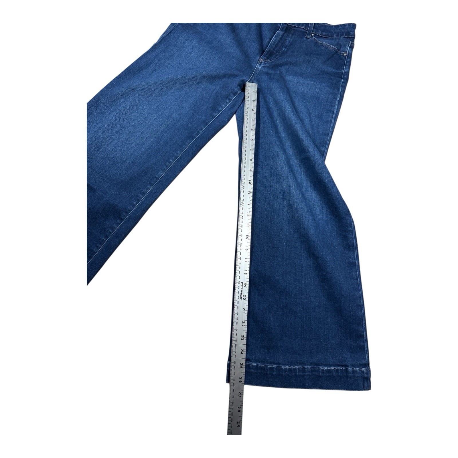 PAIGE Anessa “The Disco” high-rise wide-leg ankle jeans in blue stretch denim. Pre-owned and in clean, well-kept condition with no holes, stains, or major flaws noted; from a smoke-free home. This style features a relaxed wide-leg silhouette with an ankle-length inseam and comfortable stretch. Made from a soft cotton-blend denim for everyday wear. Designed with a high rise waist, button and zip closure, and classic five-pocket construction. Versatile premium denim suitable for casual outfits.