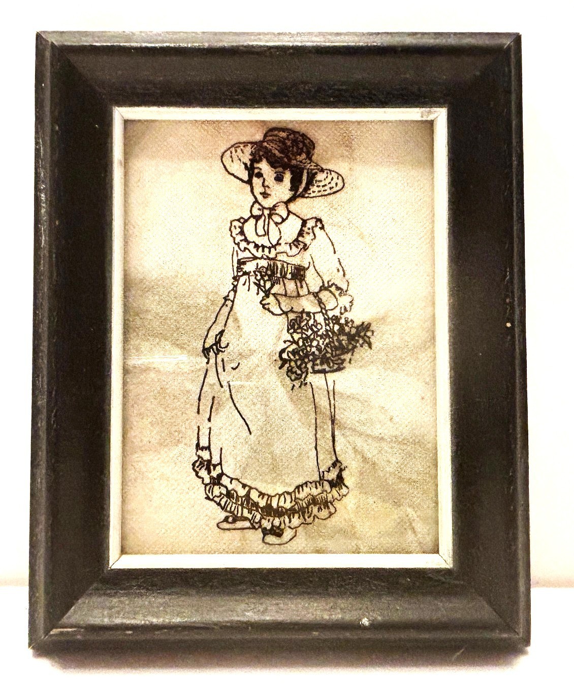 1930’s Painted Silhouette on Glass Victorian Girl Picking Flowers
