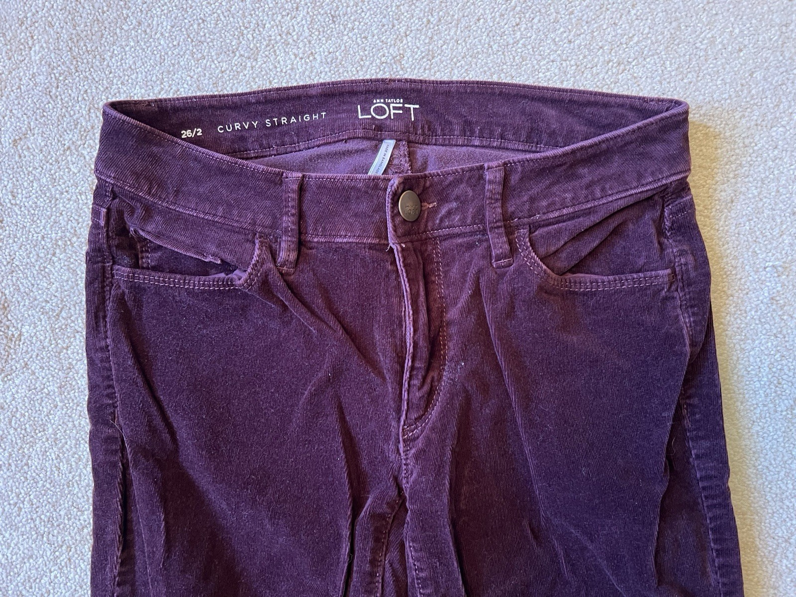 WOMEN'S PANTS DESCRIPTION : BRAND : Ann Taylor LOFT SIZE : 2 Waist (laying flat - unstretched): 14.75" Inseam: 31" COLOR : Berry Purple / Burgundy DESCRIPTION : Pants - button/zipper closure - 5 pocket style - Curvy Straight MATERIAL : Cotton / spandex (corduroy) CONDITION : Excellent used condition. PAYMENT : Payment is due within 3 days of the end of the auction. SHIPPING : Shipping is via US Post Office ONLY. RETURN POLICY : I list items to the best of my ability and try to describe each item as best as possible. Most of the items I sell are purchased at thrift shops/garage sales/etc, therefore I do not know the history to each item. Unless stated new, they are pre-owned items. I cannot guarantee items I sell are from smoke/pet free homes originally. My home is smoke free, however, I do have pets. Because computer monitors and phone screens vary in their ability to display color, color of the actual item may vary slightly. Color is not an acceptable reason for return. Items may be returned for a refund of bid price only (I will not refund any postage). Refunds will be issued once I receive the item back in the same condition as it left. If you have any problems please email me before leaving feedback. Please check out my other items - I will gladly combine shipping! Email me if you have any questions.
