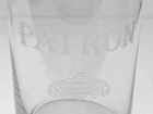 PATRON TEQUILA GLASS COCKTAIL MIXING PITCHER 6" TALL 3.25" WIDE HOLDS APPROX. 20 oz WHITE PATRON AND BEE LOGO EXCELLENT PRE-OWNED CONDITION, NO CHIPS, SCRATCHES OR WATER STAINS