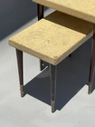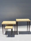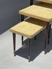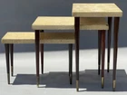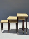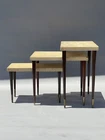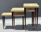 RARE ANTIQUE MODERN ART DECO CORK TOP NESTING TABLES DESIGNED BY RENOWNED ARCHITECT-ART DECO FURNITURE DESIGNER PAUL THEODORE FRANKL. (American 1886-1958). COMPRISED OF THREE EXQUISITE NESTING TABLES MADE OF MAHOGANY, CORK, AND BRASS. ORIGINAL CONDITION. SCRATCHES AND WEAR, AS SHOWN. THE LEGS ARE ROCK SOLID. RARE OPPORTUNITY. DIMENSIONS OF THE TALLEST TABLE: 15” H x 15” D x 24” W Paul Theodore Frankl (1886 - 1958) was active/lived in California / Austria. Paul Frankl is known for Designer, craftsperson, painter, writer. Paul T. Frankl (October 14, 1886 – March 21, 1958), an Art Deco furniture designer and furniture maker, architect, painter and writer from Vienna, Austria, was the son of a wealthy real estate speculator. After Frankl completed his architectural studies at the Berlin Polytechnic, he traveled, spending time in Berlin and Copenhagen before arriving in the United States in April 1914. He settled in New York City and brought with him an outsider's fresh perspective and an enthusiasm for forging a uniquely American design aesthetic. Frankl began as an architect and later switched to designing and painting fine art and furniture. In the years between the two world wars he, more than any other designer, helped shape the distinctive look of American modernism. In the 1920s, he introduced his celebrated skyscraper style (before turning to metal furnishings in the 1930s). Frankl opened Frankl Galleries on 48th Street, calling his company Skyscraper Furniture, which became an epicenter of American modernism, including modern textiles and wallpapers imported from Europe. His solo art shows included New York City's Knoedler Gallery in 1931 and Los Angeles's Stendahl Gallery in 1944. After he later relocated to Los Angeles and opened a gallery on Rodeo Drive in Beverly Hills, celebrities such as Fred Astaire, Cary Grant, Katharine Hepburn, Walter Huston and Alfred Hitchcock became clients. Frankl wrote several books and magazine articles about the Modern Style and was its most vocal proponent. He established the American Union of Decorative Artists and Craftsmen (AUDAC) in 1928. He later designed production pieces for Brown Saltman of California and Johnson Furniture Company of Grand Rapids, incorporating an early use of biomorphic designs and novel materials such as cork veneer. His style continuously evolved, from early skyscraper furniture to relaxed and casual designs favored by the Hollywood elite in the 1930s to manufactured pieces for the mass market in the 1950s In 1934 he moved to Los Angeles where he taught at the University of Southern California and the Chouinard Art Institute. Used, out-of-print books he authored sell for hundreds of dollars in online bookstores. Frankl began as an architect and later switched to designing and painting fine art. In 1934 he moved from NYC to Los Angeles where he taught at USC and Chouinard Art Institute. He died in Palos Verdes Estates, CA on March 21, 1958. Exh: Knoedler Gallery (NYC), 1931 (solo); LA Junior College, 1936; Stendahl Gallery (LA), 1944 (solo). Edan Hughes, "Artists in California, 1786-1940" American Art Annual 1933; Who's Who in American Art 1936-56.