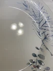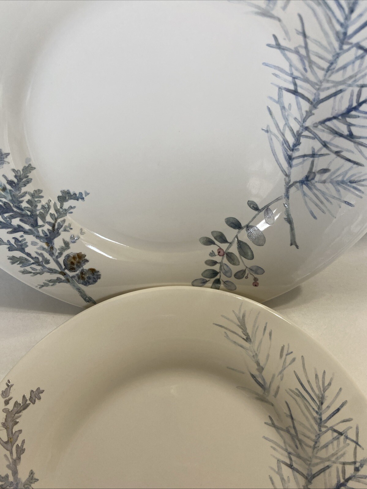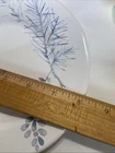 This Pfaltzgraff salad dessert plate features a Winter Frost pattern in an off white color with blue, grey, and purple hues. It is round in shape, made of stoneware/ceramic, and measures 8 inches in length. The design is nature-themed and the plate is stackable, oven and dishwasher safe. This rare item is an original production style earthenware, made in the United States, and has a glossy finish.