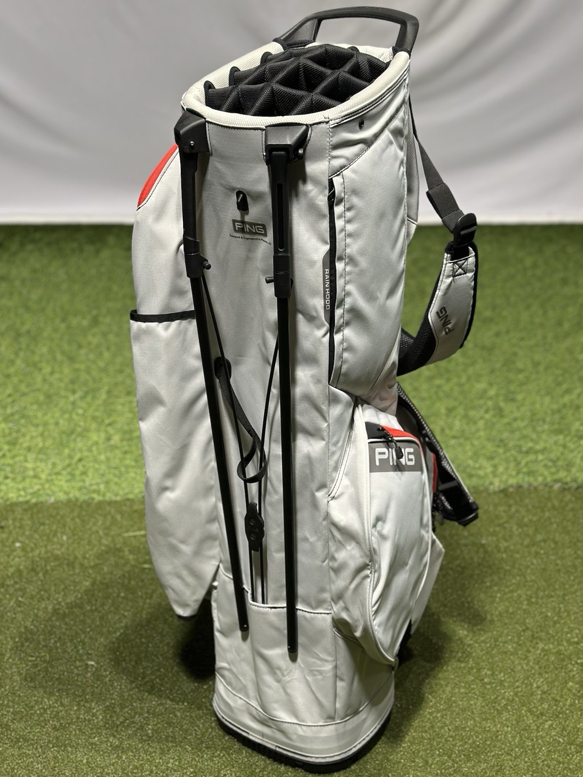 We are a reputable golf company that has been in business in St. Louis, Missouri since 1975. We have been doing this for 40 years because we do things right the first time. WE HAVE THE FASTEST SHIPPING ON EBAY! Don't believe us? Check out our Feedback. If you have questions, please feel free to ask. As always, thank you for looking. PING Hoofer 14 Stand Golf Bag COLOR: Light Grey / Red STYLE: Stand Bag DIVIDERS: 14-Way Divider CONDITION: New w/ Tags - See Pics (10/10) RAIN HOOD: Included The 14-way top is an organized golfer’s ideal arrangement, making club selection easy and orderly. To improve club removal and replacement, an innovative bag bottom guides clubs to the correct segment and keeps them separated while carrying or carting. A slimmer stacked pocket configuration allows for easier access to all 17 pockets. Made from rugged 300D polyester, Hoofer 14 sports a number of new colorways. Base With Club Dividers An innovative new bag bottom improves club removal by guiding clubs to the correct segment and keeping clubs separated while carrying. 14-Way Top The re-engineered top is more ergonomic to improve comfort and ease of handling, and 14 dividers give clubs individual attention and protection. Elevated Pocket Unique to the Hoofer 14 is a new elevated access pocket so no bending is required to access items that you want within easy reach. Big Ball Pocket An expanded ball pocket prevents the hassle of having balls spill out the sides when you have to poke around for a couple of fresh ones. Organized System A new stacked pocket configuration optimizes storage space and allows quick access the pockets you’ll use most often. Cart-Strap Channel This long-popular attribute enables you to keep the bag secured with a strap without blocking access to the pockets. Specifications: 14-Way Top 5.9 lbs. 17 Pockets 24L Pocket Volume Bag Bottom Design Improves Club Removal Leg Guards Help Leg Separation When Carrying Padded, Convertible Shoulder Straps Elevated Access Pocket Ergonomic Top Eases Handling Magnetic Rangefinder Pocket Water-Bottle Pocket Zippered Rain-Hood Pocket Cart-Strap Channel 300D Polyester