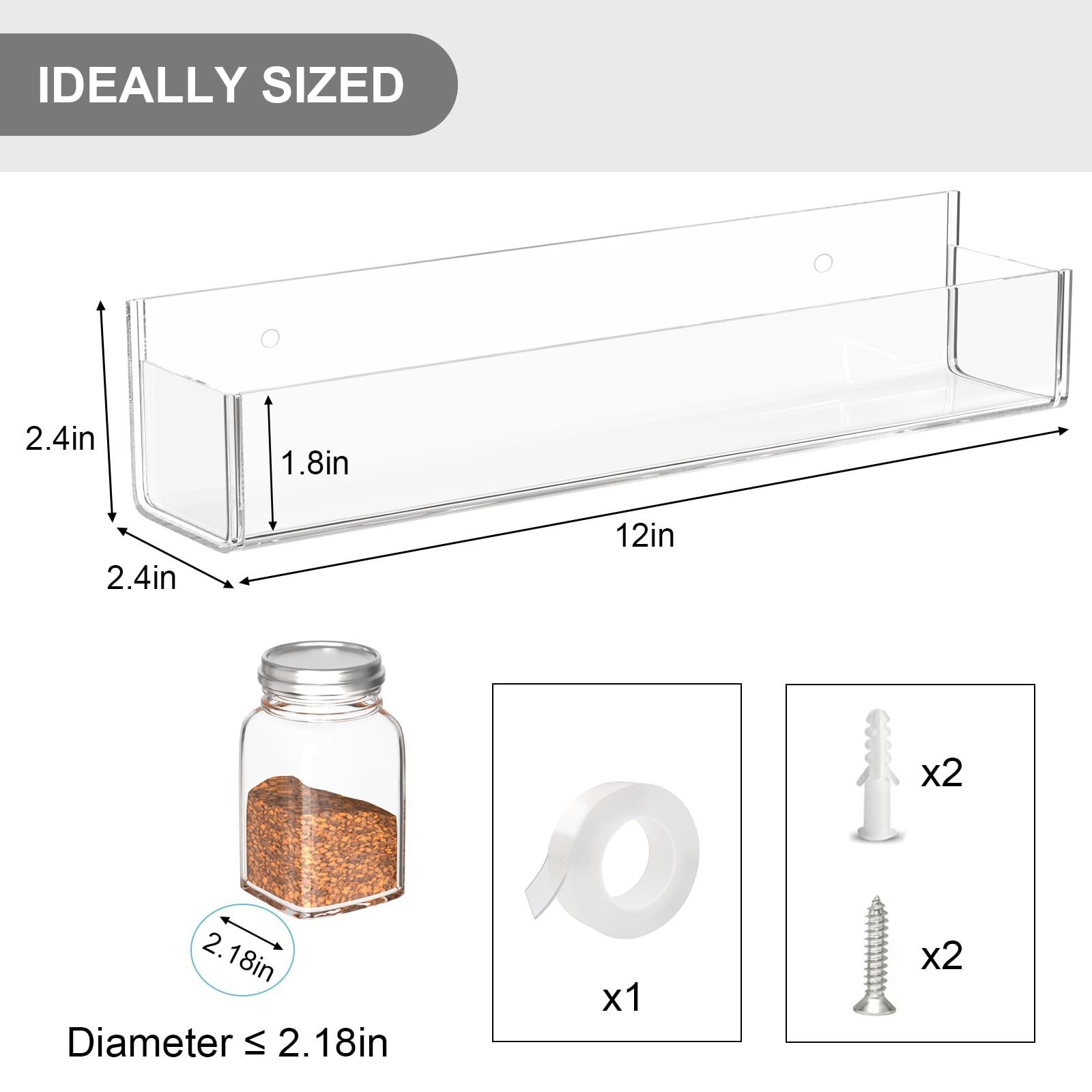 PMMASTO Adhesive Acrylic Spice Rack Organizer for Wall with 2 Nano Double Sided Tape, Spice Shelf Organization for Kitchen Cabinet Door/Pantry Door, Wall Mount Seasoning Rack (Clear-4 Pack) Product Details Size: 4 Pack-12" Color: Clear Brand: PMMASTO MPN: PM041 UPC: Does not apply EAN: Does not apply Material: Acrylic Color: Clear Special Feature: Acrylic, Durable, Wall mounted Product Dimensions: 2"D x 2"W x 11.8"H Shelf Type: acrylic shelf Material: Acrylic Color: Clear Special Feature: Acrylic, Durable, Wall mounted Product Dimensions: 2"D x 2"W x 11.8"H Shelf Type: acrylic shelf Number of Shelves: 1 Room Type: Kitchen Finish Type: Oil Assembly Required: No Mounting Type: Wall Mount Recommended Uses For Product: Cosmetics, Food Included Components: Hardware Brand: PMMASTO Style: Adjustable Item Weight: 2.05 pounds Manufacturer: PMMASTO Item model number: PM041 Date First Available: October 18, 2023 Please Note: You will get beautiful and elegant acrylic spice racks, the acrylic racks are covered with a film to prevent scratches during transportation, you need to tear off this protective film before use to restore its high transparency 2 Installation Methods: PMMASTO wall mounted spice organizer comes with 2 installation methods - self adhesive mounting & hole punching mounting; our package comes with mounting accessories - double sided nano adhesive tape and screw mounting kit, you can choose the way you like to install Flexibility: Each wall mounted spice rack organization shelf has a removable end cap at the end of the shelf, while ensuring the safety and stability of the items you place, it also facilitates the ease of placing and taking, acts as a protection for your spice jars, and also brings a sense of security to you and your items Strong and Durable: The wall acrylic clear spice storage is made of good thickened acrylic, sturdy and durable, not easy to break or deform, corrosion-resistant, moisture-proof, and can be used for many years Widely Used: PMMASTO wall mounted spice organization organizer can be placed in kitchen cabinet doors, pantry to organize spice bottles, sauces, oil jugs, etc Easy to Clean: Wipe clean with a clean cloth and it will immediately return to its original state