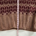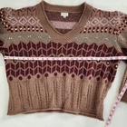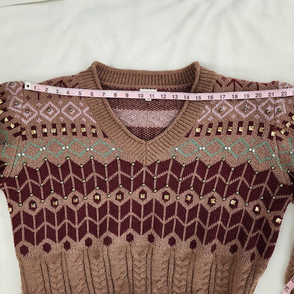 Stunning fair isle sweater featuring a beautiful geometric pattern with metallic stud embellishments. V-neck design with ribbed trim. Perfect for cozy winter days, casual outings, or festive gatherings. The earthy tones and bohemian pattern make it ideal for layering over basic pieces. A versatile statement piece that adds warmth and style to any outfit. Style: Pullover Type: Sweater Material: Acrylic, Cotton Blend, Polyester Features: V-Neck, Ribbed Trim, Chunky Knit, Geometric Pattern, Winter Weight Sleeve Type: Balloon Sleeve Fabric Type: Knit Accents: Studded Keywords: fair isle sweater, studded sweater, geometric pattern, v neck, winter knit, embellished sweater, boho sweater, chunky knit, holiday sweater, ethnic pattern, tribal print, casual sweater Clean and in great condition, with no snags, tears, or pilling. From a smoke-free home.