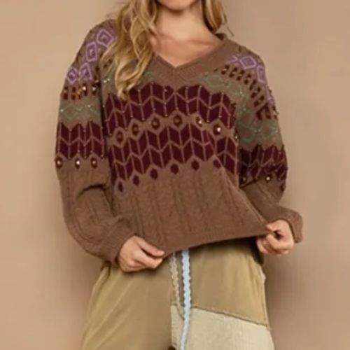 This sweater is absolutely gorgeous! The fair isle pattern and metallic studs give it such a unique, boho-chic vibe. It’s super cozy and warm, perfect for winter layering. The V-neck and ribbed trim add a flattering touch, and the earthy colors make it easy to pair with anything. Love how stylish yet comfortable it is—definitely a wardrobe staple!