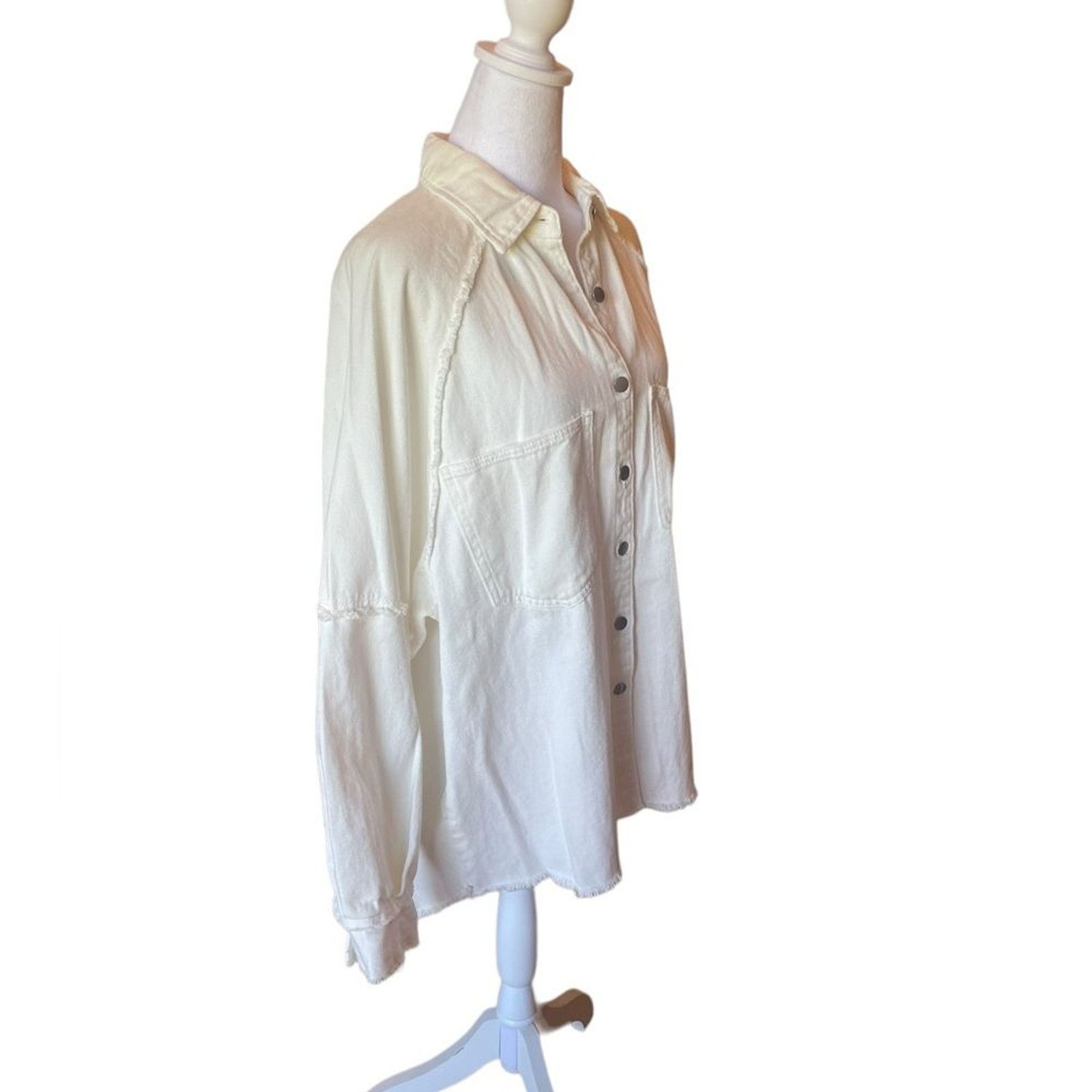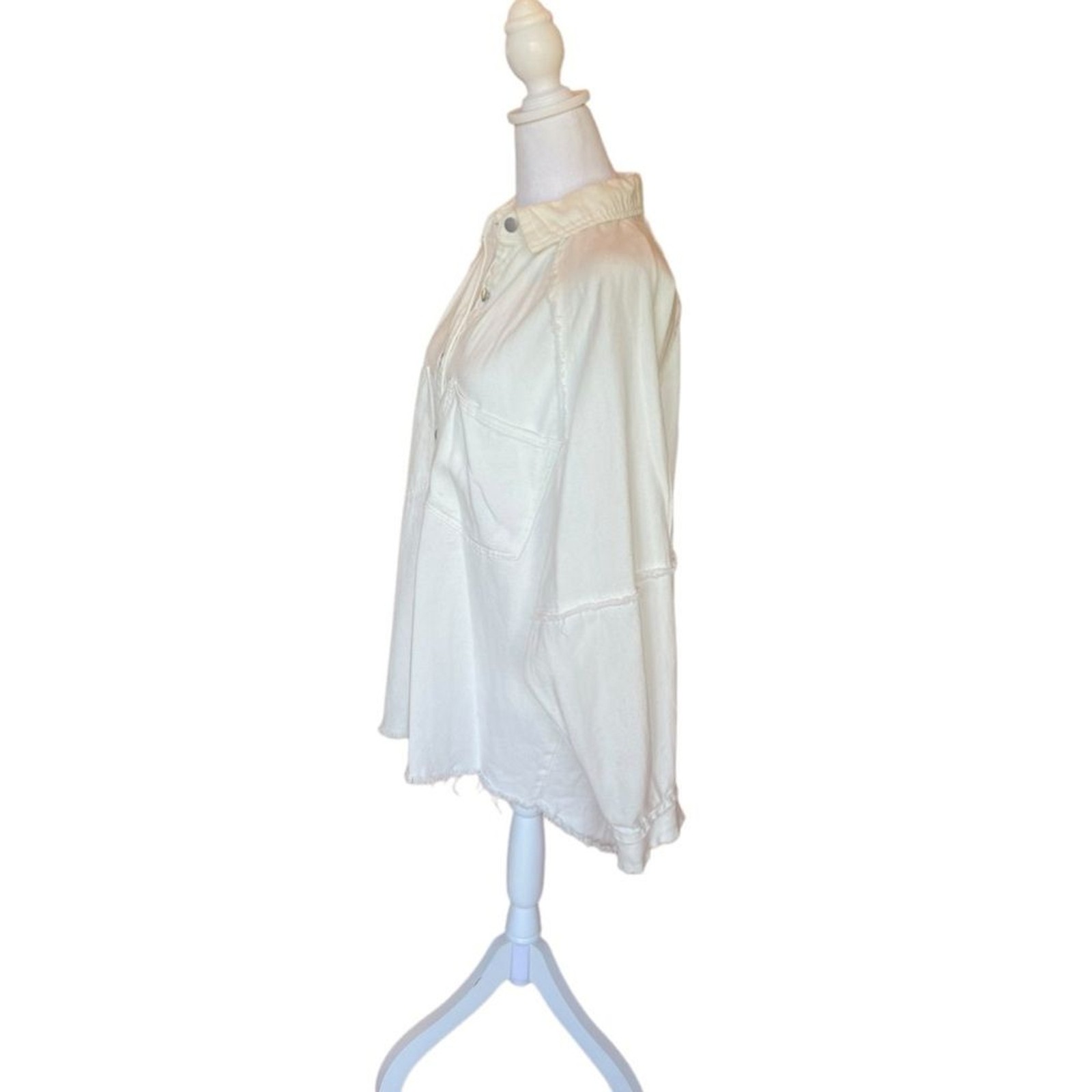 POL White Star High Low Oversized Cotton Shacket Jacket Womens Size Small Medium Garment missing size tag so please use flat lay measurements Its meant to be a bit oversized so small medium would be a good bet Excellent condition with a small spot of speckled discoloration on back of collar shown in last photo Button up flowy lightweight 100 percent cotton Star embroidered onto back