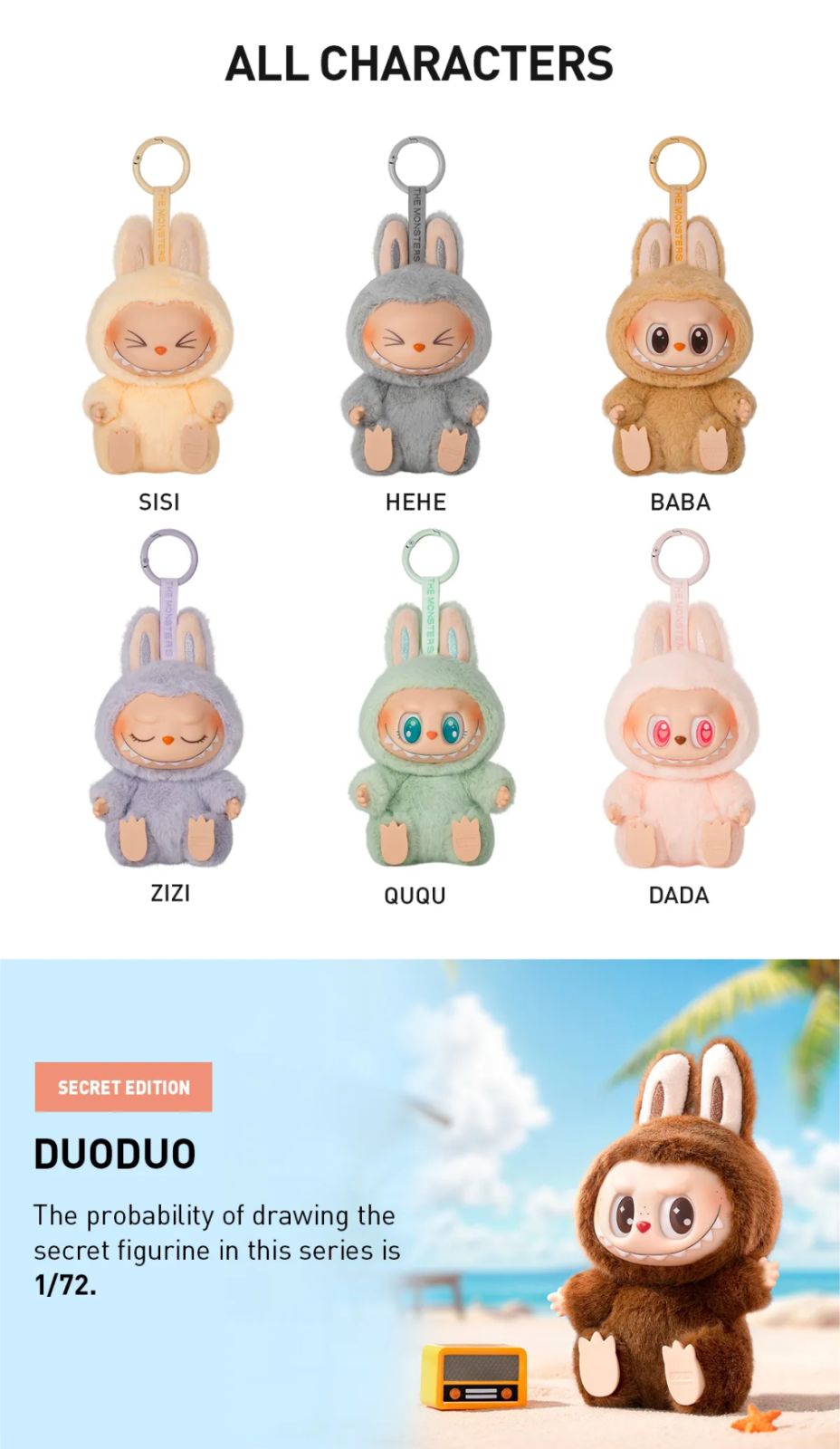 Preorder a NEW and unopened authentic POP MART random blind box. 1/6 chance to unbox Sisi, Hehe, Baba, Zizi, Ququ, or Dada. 1/72 chance to unbox Duoduo! Package will ship from China and will arrive in the US by early/mid-May. Ships to you from San Francisco, California within 1 day of arrival with 2-5 day shipping. Will keep you updated on its progress. Thanks for looking!