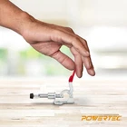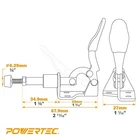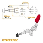The POWERTEC 20323 Push/Pull Quick-Release Toggle Clamps , 100 lbs Capacity, 301A , 4PK , deliver a rock-solid grip on your stock when your project requires a push/pull holding-action that locks your workpiece, flush and tight, against a positive stop. Their unique design features a high-utility cam/lever system to insure the ultimate in fastening security and stability. FEATURES Their quick and easy adjustability means customizing clamp to stock thickness and placement is hassle free. To utilize, just easily install base onto your jig/fixture, adjust the reach to suit your projects specific requirements, and pull handle back to insure optimal pushing force on your stock - it's that easy. The rubber clamping foot won't mar your stock surface, and the large, plastic handle supplies a comfortable and ergonomic grip. SPECS Clamping Base Dimension: 1-5/16" to 1-1/16" Mounting slot measures: 5/32" DIA Clamping range extends from 1-3/16" to 2-1/4" Bolt length (including rubber feet): 1" Clamp height capacity when fastened: 1-7/8" Total Clamp length (including handle) during use: 3" to 3-9/16"