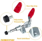 INCLUDES: (6) Push pull quick release toggle clamp (Type-301A) FUNCTION: Push/pull action can quick and easy adjustability means customizing clamp to stock thickness and placement is hassle free. Large, plastic handle maximizes user comfort, safety and control PREMIUM DESIGN: Constructed of zinc-plated, cold-rolled carbon steel for optimal durability and wear-resistance, and the unique design features a high-utility cam/lever system to insure the ultimate in fastening security and stability. HOLDING CAPACITY: 100 lbs SPECS: Clamping Base Dimension: 1-5/16" to 1-1/16"; Mounting slot measures: 5/32" DIA; Clamping range extends from 1-3/16" to 2-1/4"; Bolt length (including rubber feet): 1"; Clamp height capacity when fastened: 1-7/8"; Total Clamp length (including handle) during use: 3" to 3-9/16" The POWERTEC 20323 Push/Pull Quick-Release Toggle Clamps , 100 lbs Capacity, 301A , 4PK , deliver a rock-solid grip on your stock when your project requires a push/pull holding-action that locks your workpiece, flush and tight, against a positive stop. Their unique design features a high-utility cam/lever system to insure the ultimate in fastening security and stability. FEATURES Their quick and easy adjustability means customizing clamp to stock thickness and placement is hassle free. To utilize, just easily install base onto your jig/fixture, adjust the reach to suit your projects specific requirements, and pull handle back to insure optimal pushing force on your stock - it's that easy. The rubber clamping foot won't mar your stock surface, and the large, plastic handle supplies a comfortable and ergonomic grip. SPECS Clamping Base Dimension: 1-5/16" to 1-1/16" Mounting slot measures: 5/32" DIA Clamping range extends from 1-3/16" to 2-1/4" Bolt length (including rubber feet): 1" Clamp height capacity when fastened: 1-7/8" Total Clamp length (including handle) during use: 3" to 3-9/16"