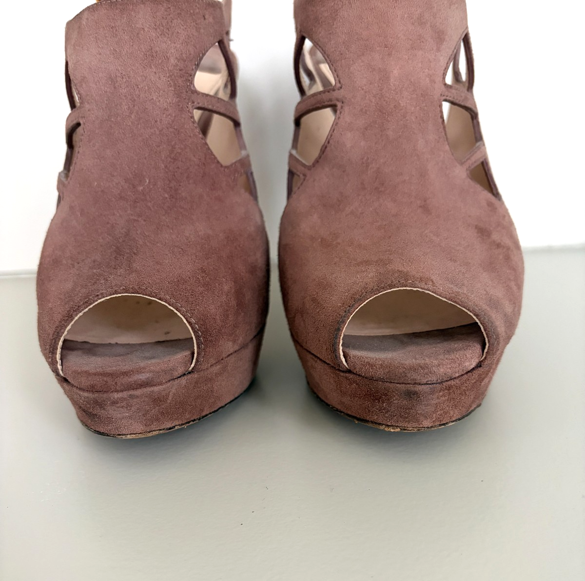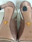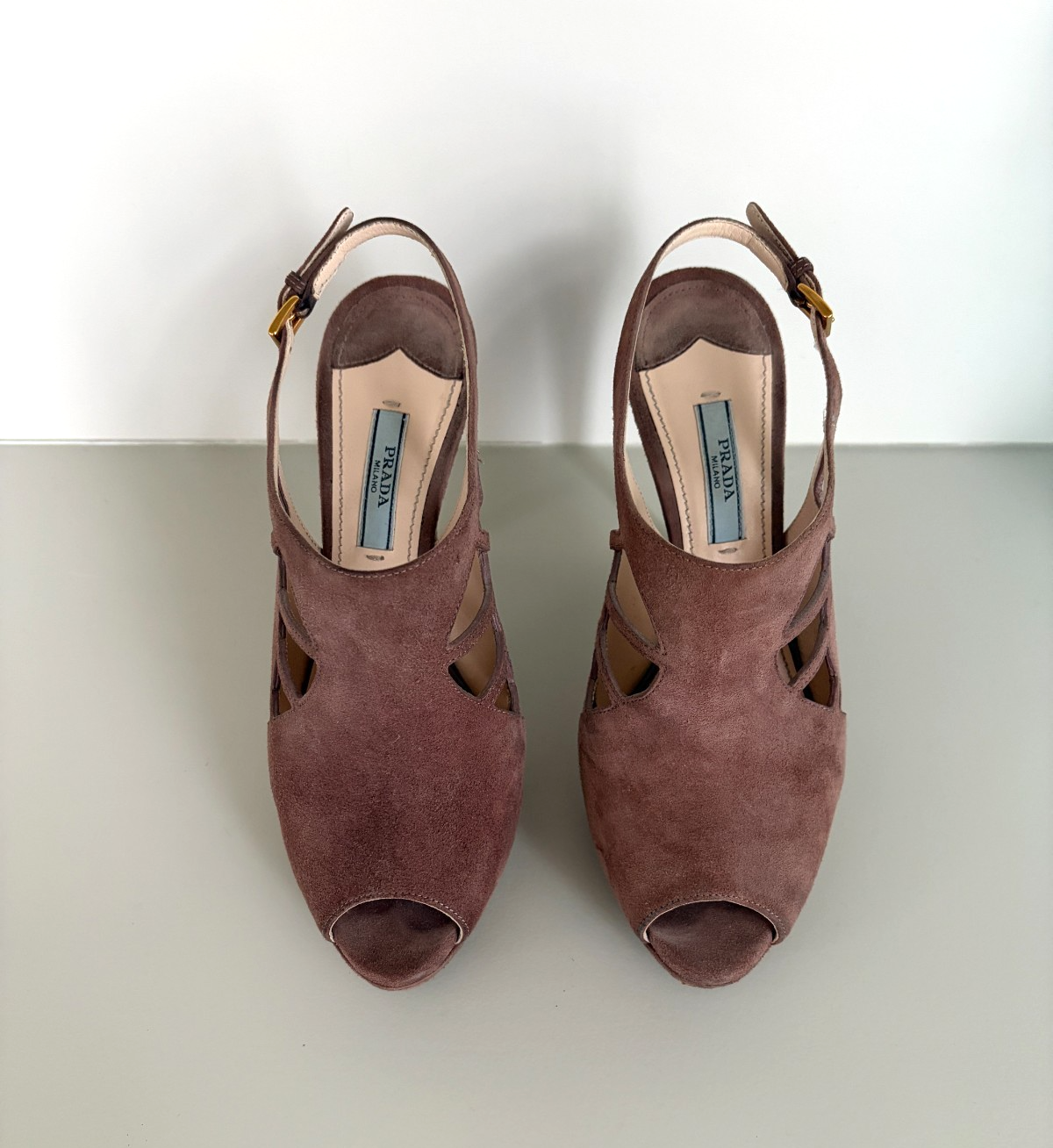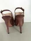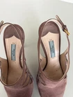 PRADA Camoscio Dark Rose/Blush Suede Heels Size IT 38 US 7.5-8 Cut out Slingback Pump Platform Peep Toe Gold Buckle Closure at ankles Heel Height 4.5" Comes with box and dust bag Made in Italy Shoes are in Good Pre Owned Condition with some wear and smudges - please see all pics -last one Please email with any questions Comes from a smoke free and pet free home Thank you for looking