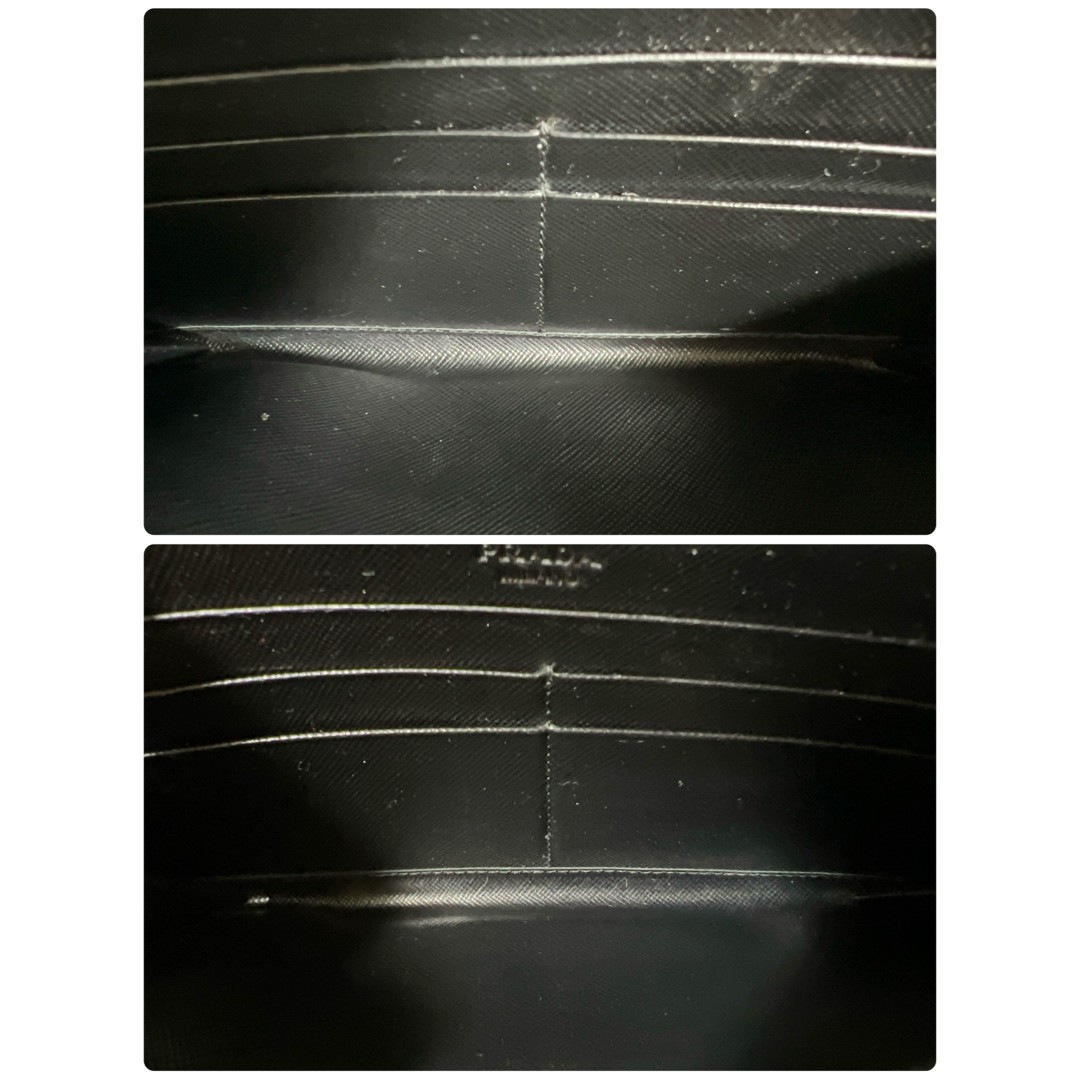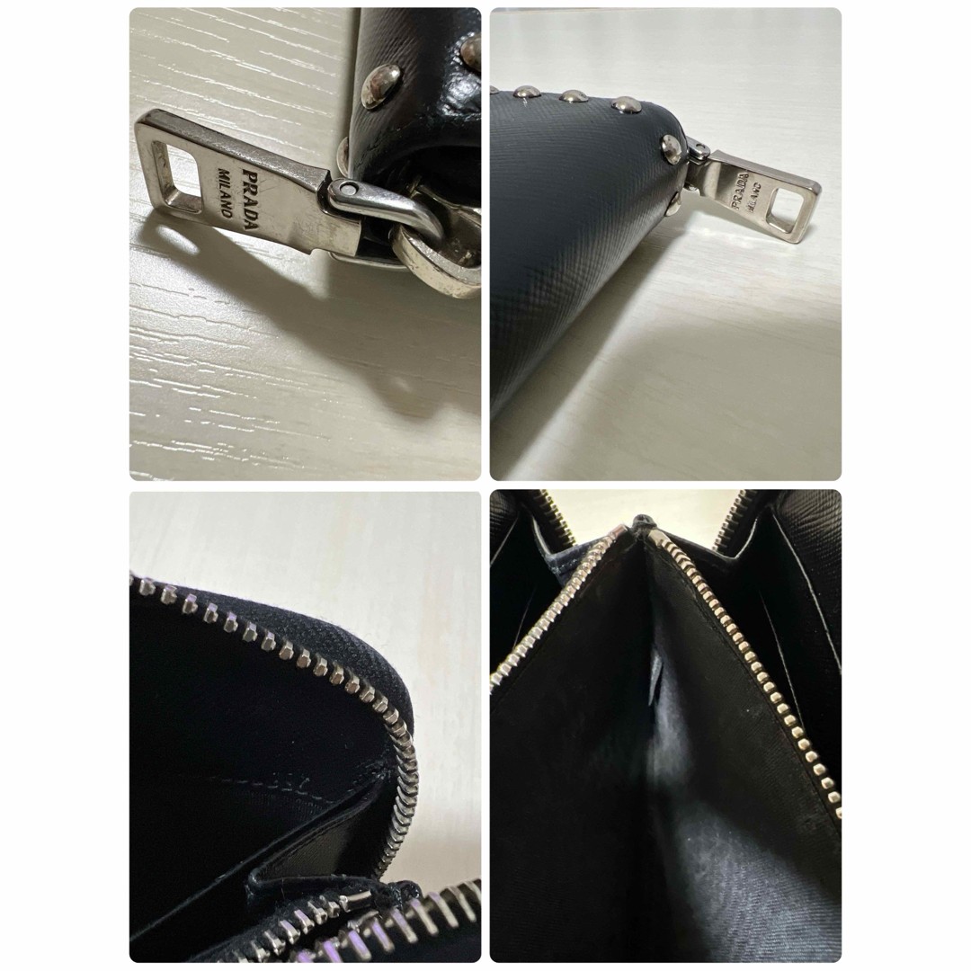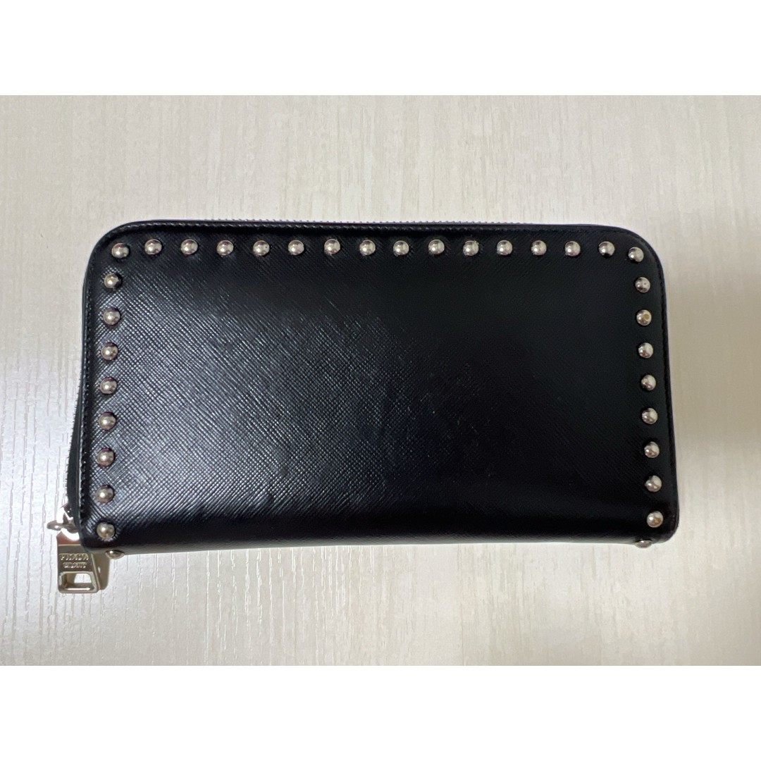 PRADA Saffiano studded black leather wallet round zipper Item Description Studded black leather wallet with elegant design from PRADA. - Brand: PRADA- Color: Black- Design: With studs- Material: Leather Approx. 10.5cm, Width approx. 19cm Stamped 107 Billfold 2 coin purse 1 card holder 8 pockets Two boxes cannot be included as they are used in photography. I'm taking a bright photo. Payment Shipping Return Policy International Buyers Please Note Import duties, taxes, and charges are not included in the item price or shipping cost. These charges are the buyer's responsibility. Please check with your country's customs office to determine what these additional costs will be prior to bidding or buying.