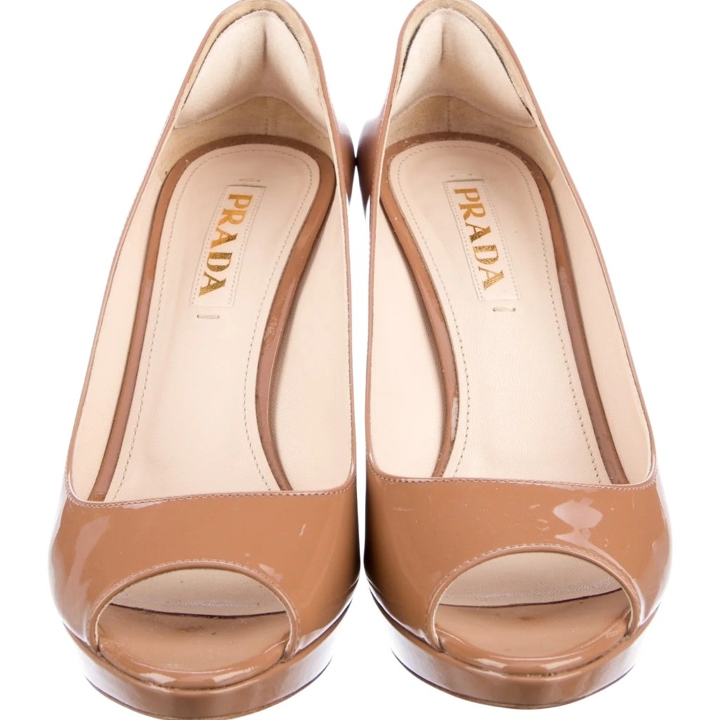 These are a pair of women's Prada (1KP136) peep-toe platform pumps in a glossy beige patent leather finish. The shoes feature a high 3.5" (9.5 cm) stiletto heel and a subtle platform sole. The interior is lined with light-colored leather, and the "PRADA" brand name is visible on the insoles. EU size 37.5 is American 7 to 7.5 Pre-Owned: Very Good Condition These are guaranteed authentic shoes from my home closet. Original box is included