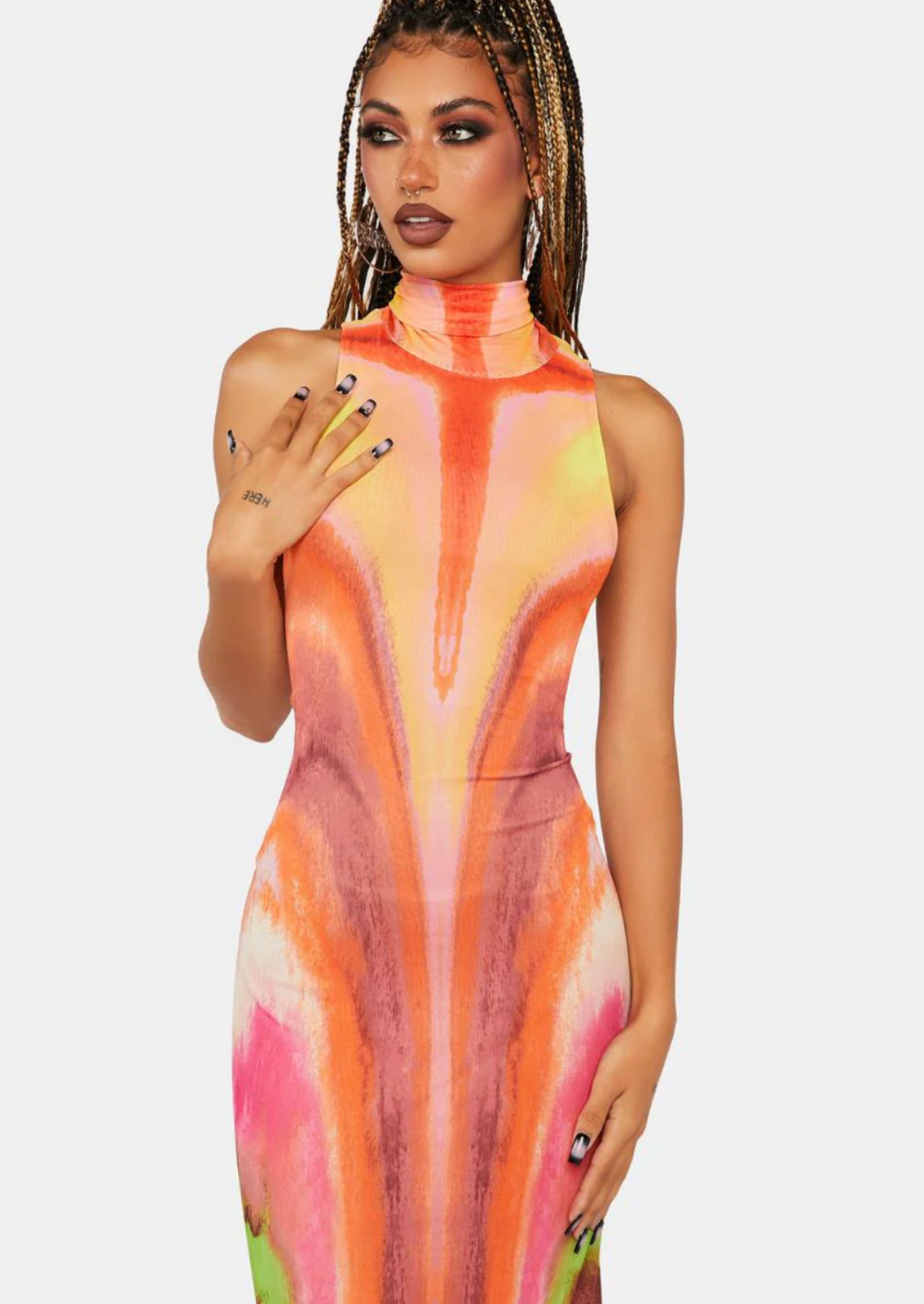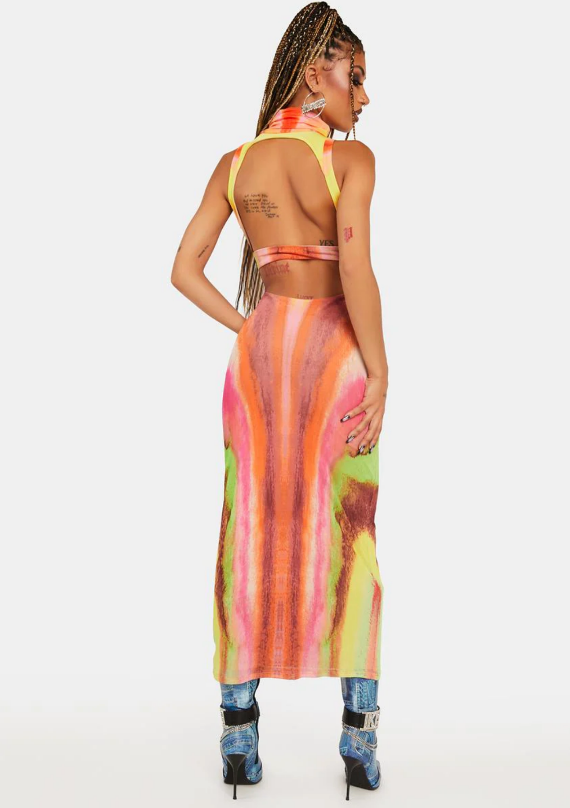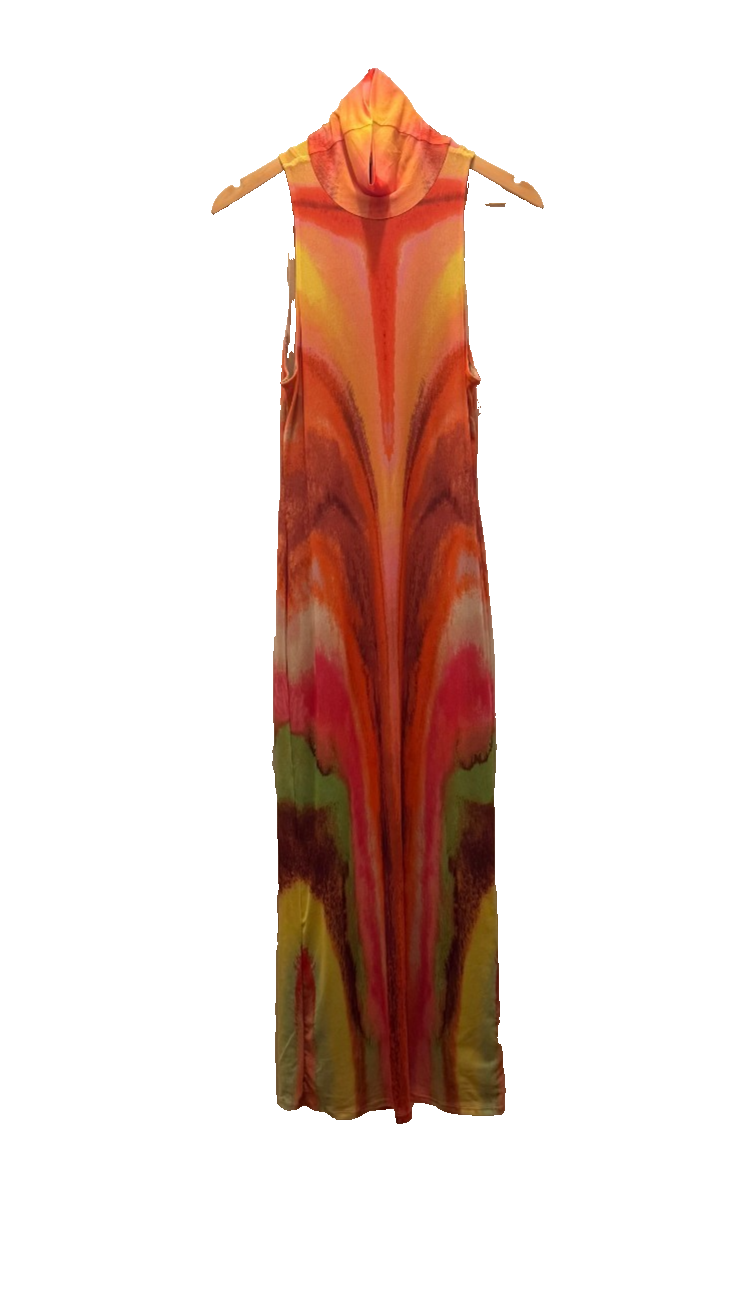 Neon Watercolor Serenity Midi Dress This sleeveless midi dress has a mesh construction with an open back, a turtleneck detail, a fitted silhouette, and a tie dye print all over. In pristine condition worn once 10/10 Materials 96% Polyester 4% Spandex Lining 95% Polyester 5% Spandex Care Machine Washable, Air Dry Orig $85