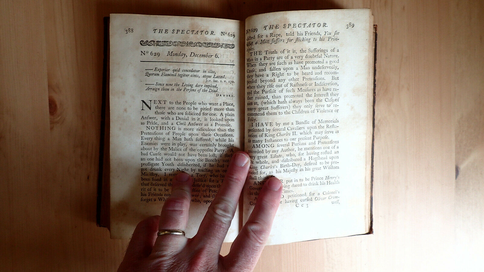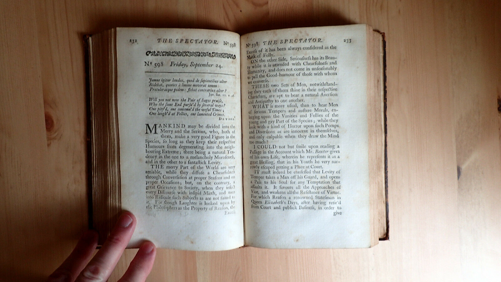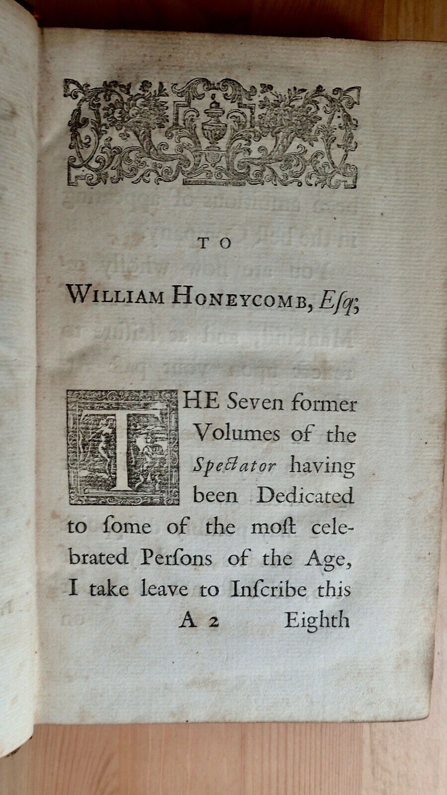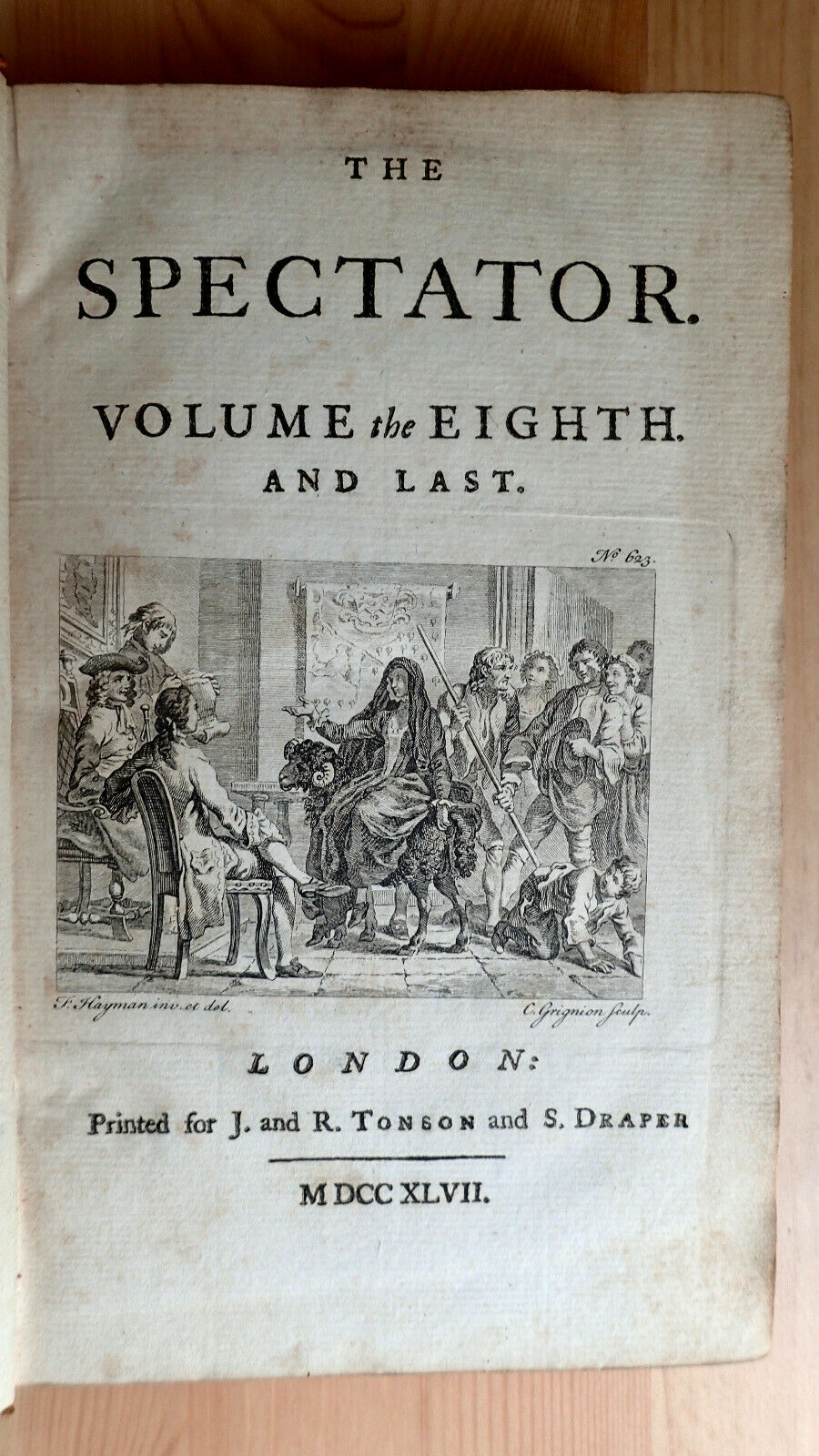 Up for auction is a volume of The Spectator Volume The Eighth And Last London Printed for J. And R. Tonson and S. Draper 1747. This is Vol 8 only of a larger 8 vol set. This volume is unique in that it contains the bookplate of Lieutenant Colonel Cooper 2nd Somerset Militia. I was not able to find much on Lt. Cooper although I believe the Somerset Militia is an English Regiment with a long and illustrious history. Condition overall good: Bound in full leather expect scuffing to leather spine is dry. Internally age toning, light foxing still bound tightly. Contains dedication, and 429 pp. plus index. As always any questions feel free to ask. The Spectator was a daily publication founded by Joseph Addison and Richard Steele in England, lasting from 1711 to 1712. Each "paper", or "number", was approximately 2,500 words long, and the original run consisted of 555 numbers, beginning on 1 March 1711.[1] These were collected into seven volumes. The paper was revived without the involvement of Steele in 1714, appearing thrice weekly for six months, and these papers when collected formed the eighth volume. Eustace Budgell, a cousin of Addison's, and the poet John Hughes also contributed to the publication.