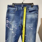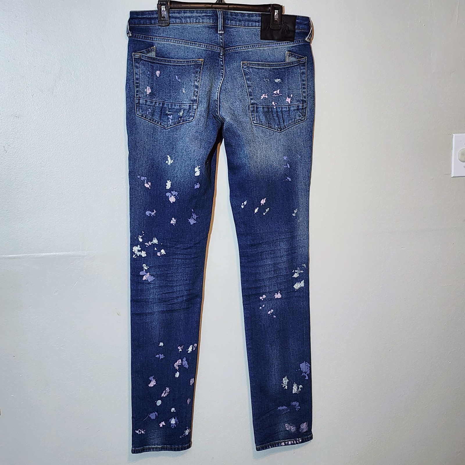 PRPS Le Sabre Jeans Mens 33 Blue Stretch Paint Splatter Distressed Denim Pants Condition: Good used condition with visible painted splatter and light distressing, intentional rips at several spots, no major flaws or holes beyond design elements Material: 91% cotton, 7% polyester, 2% elastane for stretch and comfort Classic five-pocket design with PRPS branded hardware and patch on waistband Paint splatter design in white, lavender, and purple hues on front and back Style: Le Sabre, modern slim fit with stretch Button features PRPS branding, style code E95P504FS Color: Indigo blue with multicolor paint effects Made in UAE Tag size: 33 Mens Special embroidered 'STRETCH' notation at inner waistband Interior patch: PRPS Goods & Co. Fit Le Sabre, Bruised, Never Broken Care: Machine wash cold, wash inside out, do not tumble dry, cool iron inside out if needed Great statement denim for streetwear and casual looks
