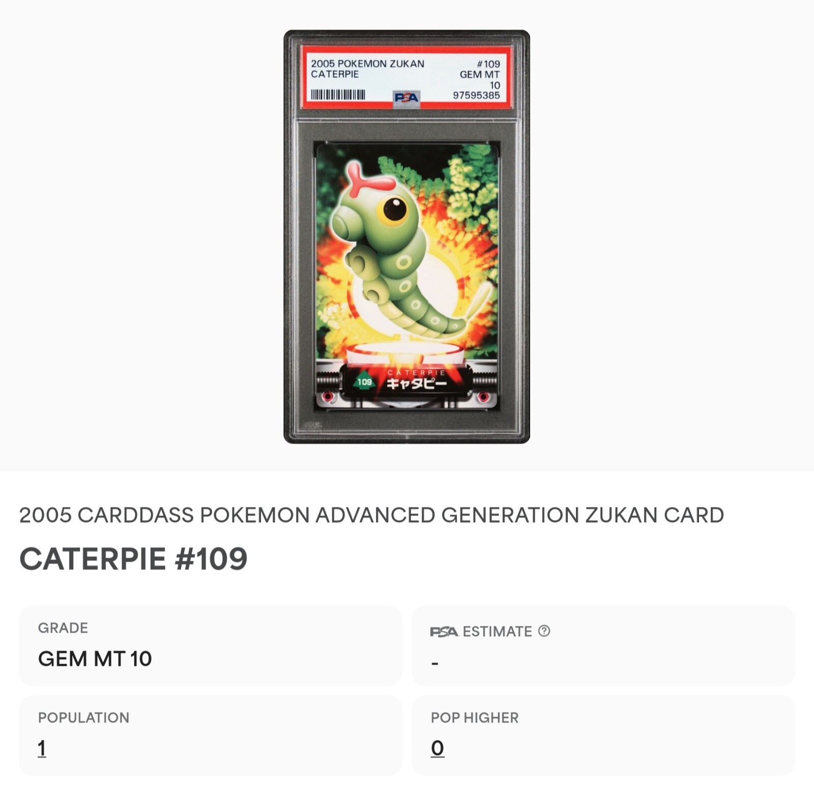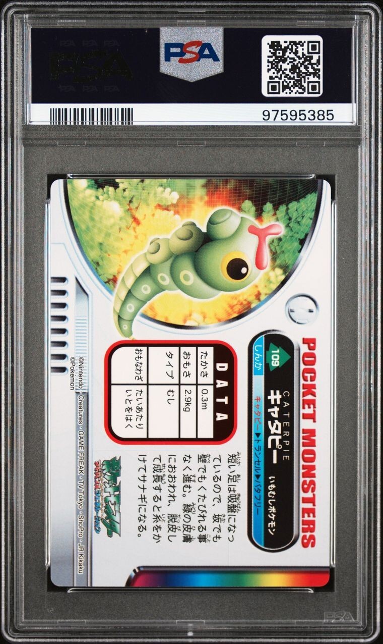 PSA 10 GEM MINT Caterpie #109 Carddass Zukan Advanced Gen. Bandai Pokémon POP 1. POP 1 as of 12/8/24. Please reach out with any questions and we would be happy to assist you. Returns are not accepted. You will receive the exact graded card pictured. Please see high resolution scans. Purchase of this item signifies agreement that Grade, Actual Condition and expected standards all match. Please see PSA website for more info. Shipping info: All graded cards are shipped securely in bubble mailer and cardboard box; regardless of price. Please reach out with any concerns before contacting ebay and we'd be happy to assist you. Please note that due to inventory accuracy, purchases will not be cancelled before or after shipping. Please reach out with any questions before purchase and we would be happy to assist you.