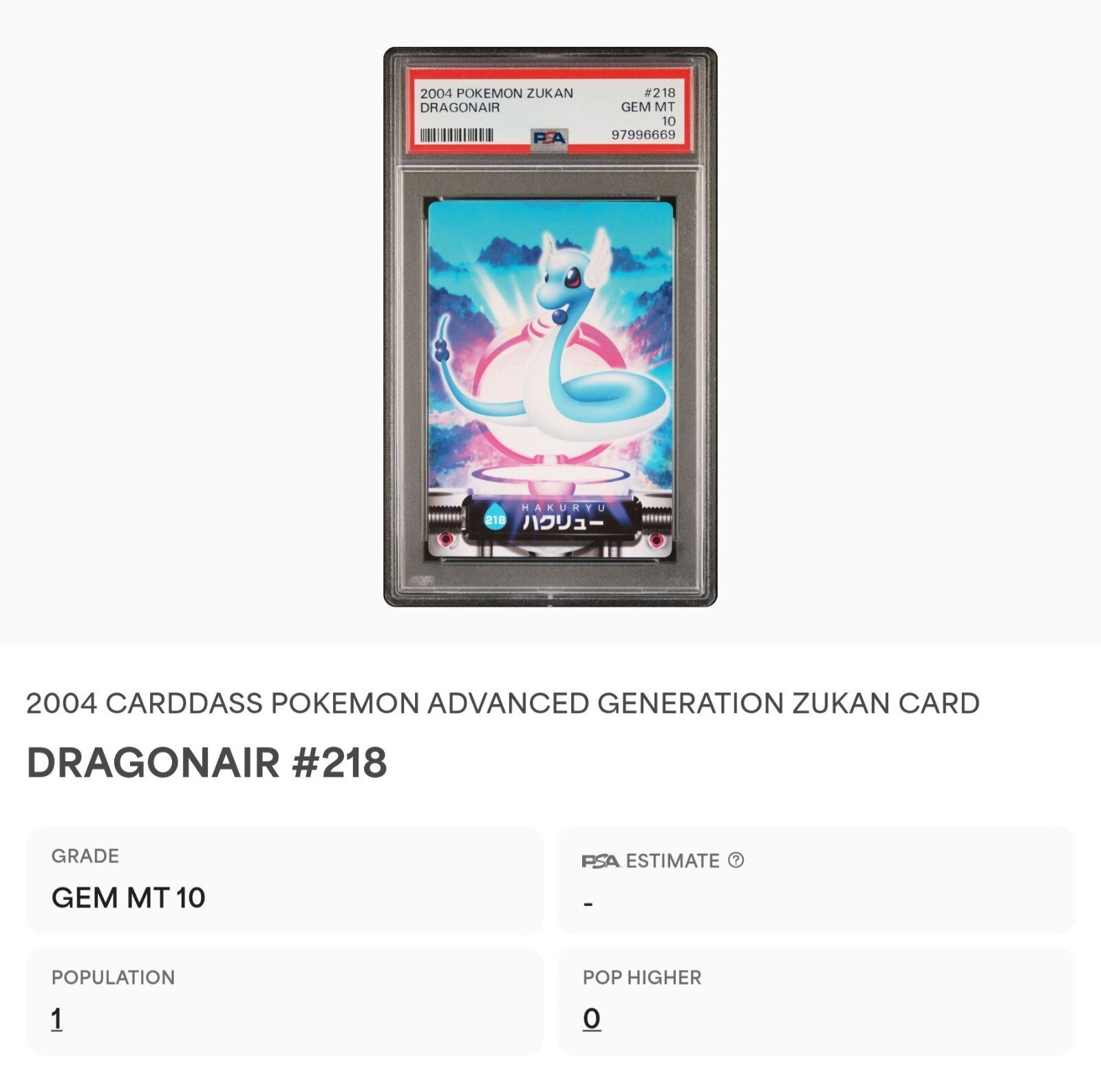 PSA 10 GEM MINT Dragonair #218 Carddass Zukan Advanced Gen. Bandai Pokémon POP 1. POP 1 as of 12/8/24. Please reach out with any questions and we would be happy to assist you. Returns are not accepted. You will receive the exact graded card pictured. Please see high resolution scans. Purchase of this item signifies agreement that Grade, Actual Condition and expected standards all match. Please see PSA website for more info. Shipping info: All graded cards are shipped securely in bubble mailer and cardboard box; regardless of price. Please reach out with any concerns before contacting ebay and we'd be happy to assist you. Please note that due to inventory accuracy, purchases will not be cancelled before or after shipping. Please reach out with any questions before purchase and we would be happy to assist you.