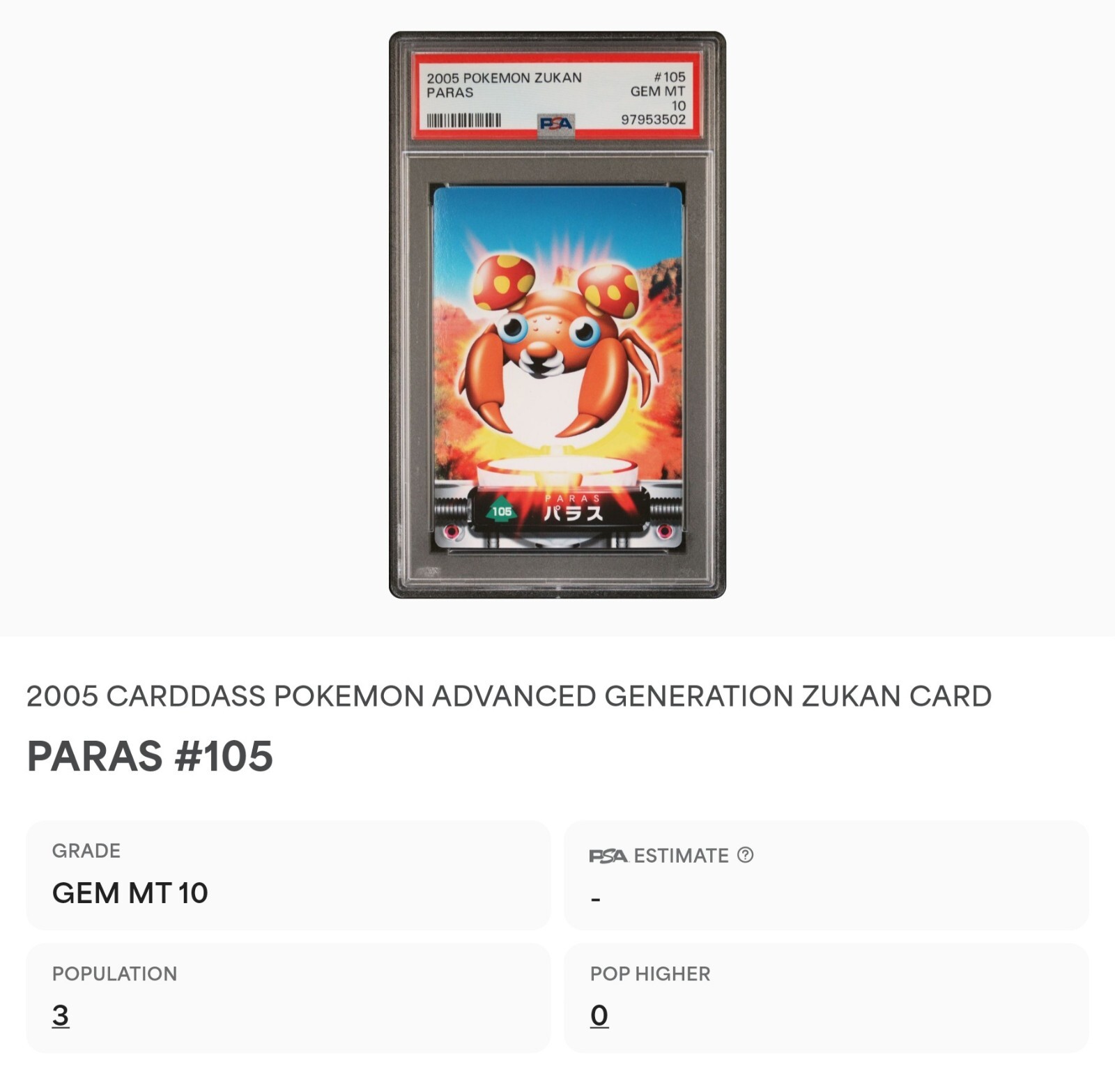 PSA 10 GEM MINT Paras #105 Carddass Zukan Advanced Gen. Bandai Pokémon TCG POP 3. POP 3 as of 12/14/24. Please reach out with any questions and we would be happy to assist you. Returns are not accepted. You will receive the exact graded card pictured. Please see high resolution scans. Purchase of this item signifies agreement that Grade, Actual Condition and expected standards all match. Please see PSA website for more info. Shipping info: All graded cards are shipped securely in bubble mailer and cardboard box; regardless of price. Please reach out with any concerns before contacting ebay and we'd be happy to assist you. Please note that due to inventory accuracy, purchases will not be cancelled before or after shipping. Please reach out with any questions before purchase and we would be happy to assist you.