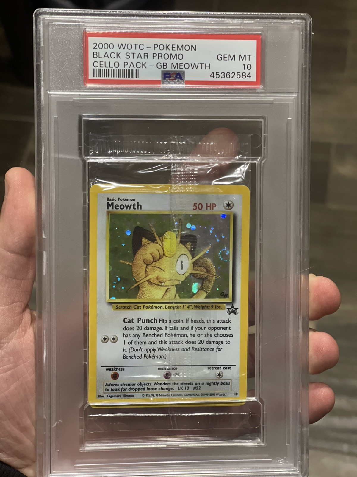 The product is a PSA 10 Meowth Black Star Promos Holo GameBoy card from the Pokémon TCG. This rare and highly sought after card features an exclusive illustration by Kagemaru Himeno and is part of the Wotc Promo set. With a POP of only 16, this sealed card is in mint condition and has been professionally graded by the Professional Sports Authenticator (PSA). Perfect for collectors and fans of the Pokémon franchise, this card is a valuable addition to any card collection.