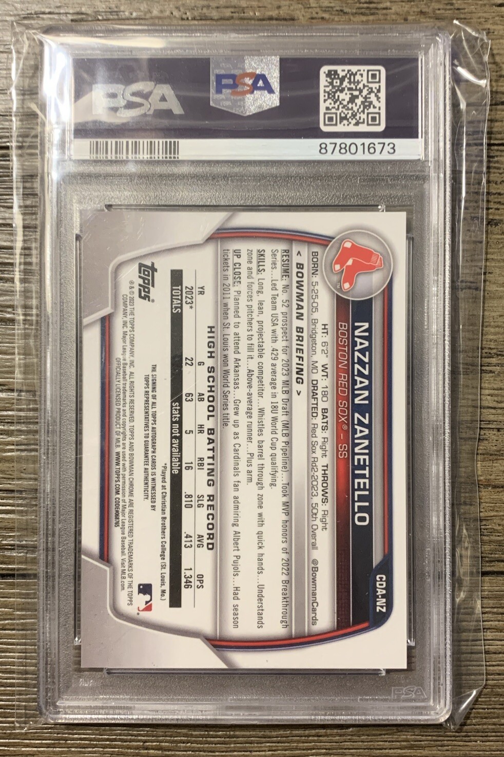 This is a rare opportunity to own a graded 10 NAZZAN ZANETELLO AUTO 1st 2023 Bowman Chrome Draft RED SOX RC GEM MINT trading card. This card features a Major League (MLB) League and is part of the 2023 Bowman Chrome set. It is also autographed, making it a valuable addition to any baseball fan's collection. The card has been professionally graded by Professional Sports Authenticator (PSA) and is a great investment for any collector. It is a Rookie card and comes in a Chrome parallel/variety. This card is perfect for fans of the Red Sox and is a must-have for anyone who loves baseball.