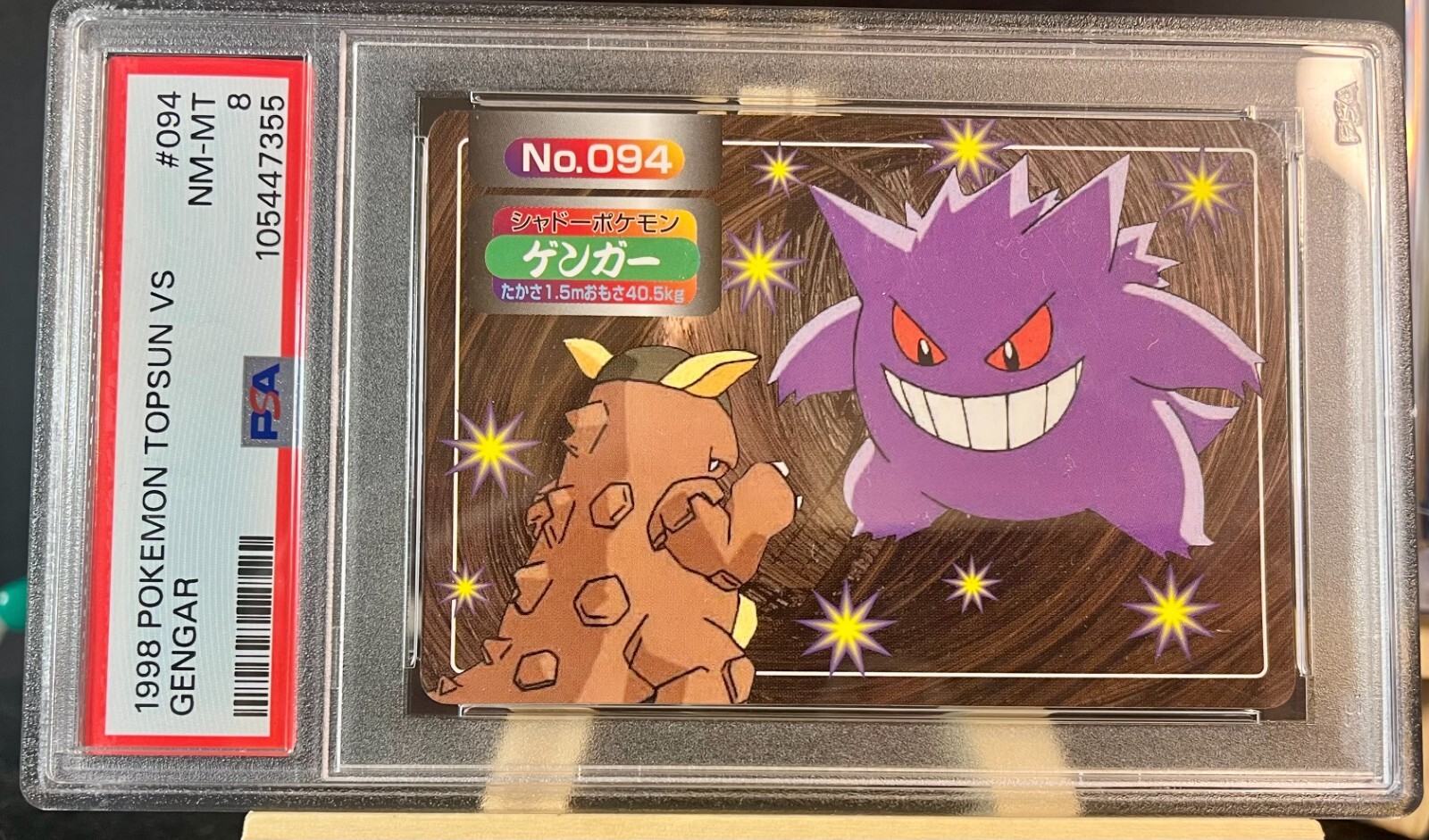 PSA 8 Pokémon Card Gengar vs Kangaskhan No.094 Japanese Topsun VS 1998 PSA # 105447355 For all the Pokémon TCG collectors out there, here is a rare find! This vintage Gengar Topsun card, numbered 094 VS Kangaskhan, is a must-have addition to your collection. Manufactured in Japan in 1998 by Nintendo, this card features a beautiful Japanese finish and is made of high-quality paper material. Visit my store! Dimensions 3.5" H x 2.5" W x 0.012" D Ship Weight 0.004 pounds Sorry, no international shipping! Your item is packed with care and shipped the same day! ***I strive to provide 5-star service to all of my customers. If you receive 5-star service, please leave feedback indicating so. If you did not, for any reason, please message me and let me know so I can make it better for you. Your feedback is very important to me and allows me to continue offering great service to my customers. ***
