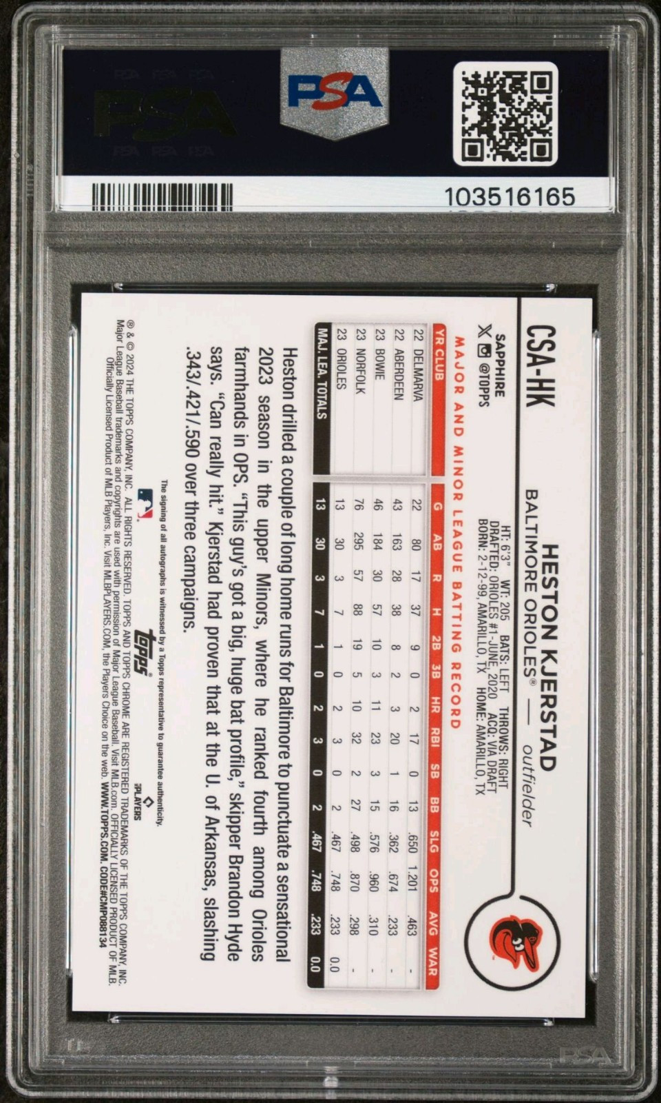 The 2024 Topps Chrome Sapphire Heston Kjerstad Auto RC trading card features an autograph from the Baltimore Orioles rookie baseball player. This limited edition card is serial numbered out of 199 and is a part of the exclusive Sapphire parallel variety set by Topps for Major League Baseball collectors. It is a highly sought-after collectible for fans of the sport and the player.
