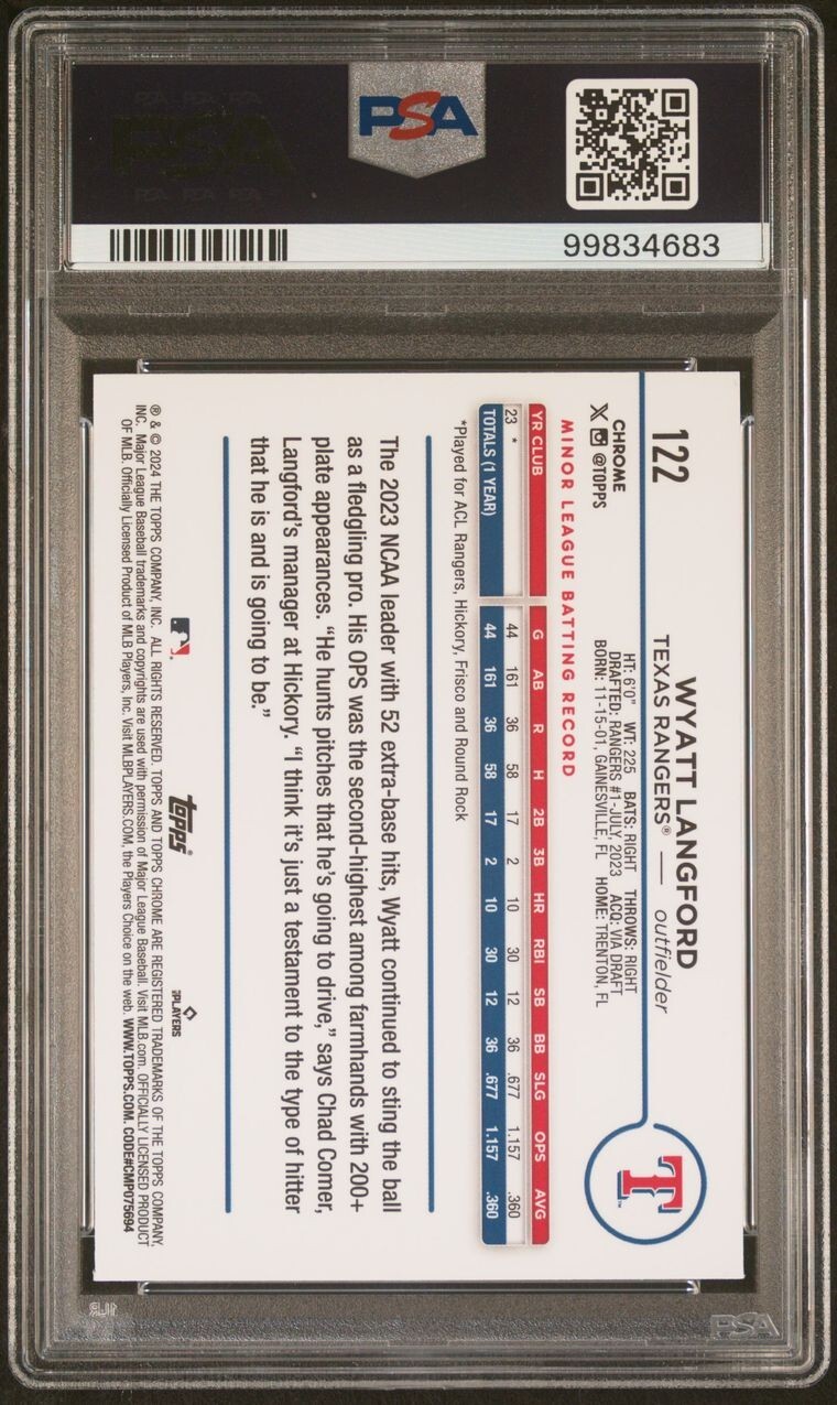 Elevate your baseball card collection with the 2024 Topps Chrome #122 featuring the promising talent, Wyatt Langford of the Texas Rangers. This Blue Sonar Refractor card is a standout with its vibrant color match, capturing the essence of Langford's potential. The card, part of the esteemed Topps Chrome set, is a must-have for enthusiasts and collectors alike. Notably, this card is serial numbered, indicating its uniqueness among others in the series. It has been professionally graded by PSA with an impressive score of 9, certifying its Mint status. With the card's inclusion of parallel variety and rookie status, it holds a special place in the 2024 MLB season memorabilia, celebrating the sport and its rising stars.