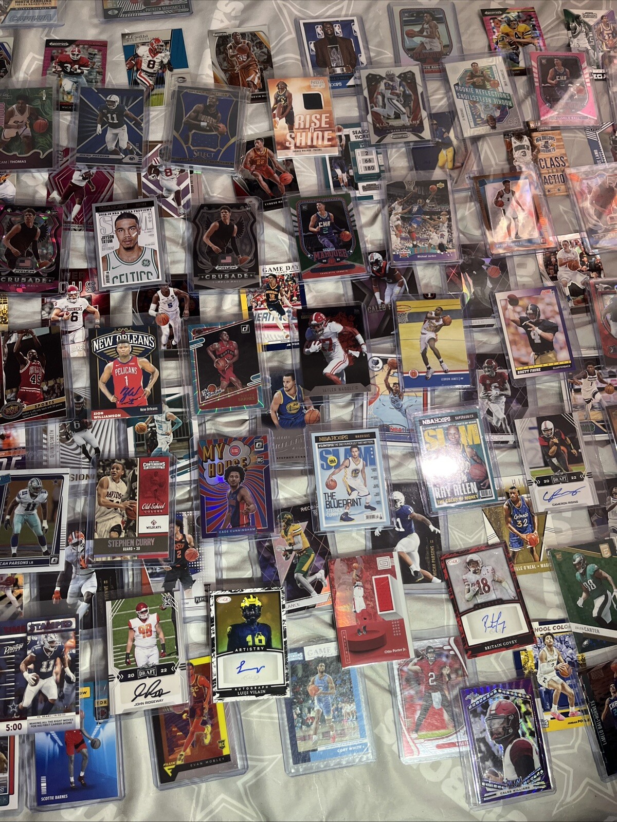 This is a sports trading card lot featuring three autographed rookie patch cards from the 2021 season of the National Football League (NFL) and other sports leagues. The cards are autographed by players such as Cj Stroud, Allen Iverson, Aaron Jones, and A.J. Brown. Each card is framed and serial numbered, with hologram authentication from Panini Authentic. The lot includes a mix of rookie, parallel, 1st edition, insert, and chase cards from various teams like the Cincinnati Bengals, Green Bay Packers, Chicago Bulls, and more. These limited edition cards are in pristine condition, making them a valuable addition to any collector's collection.
