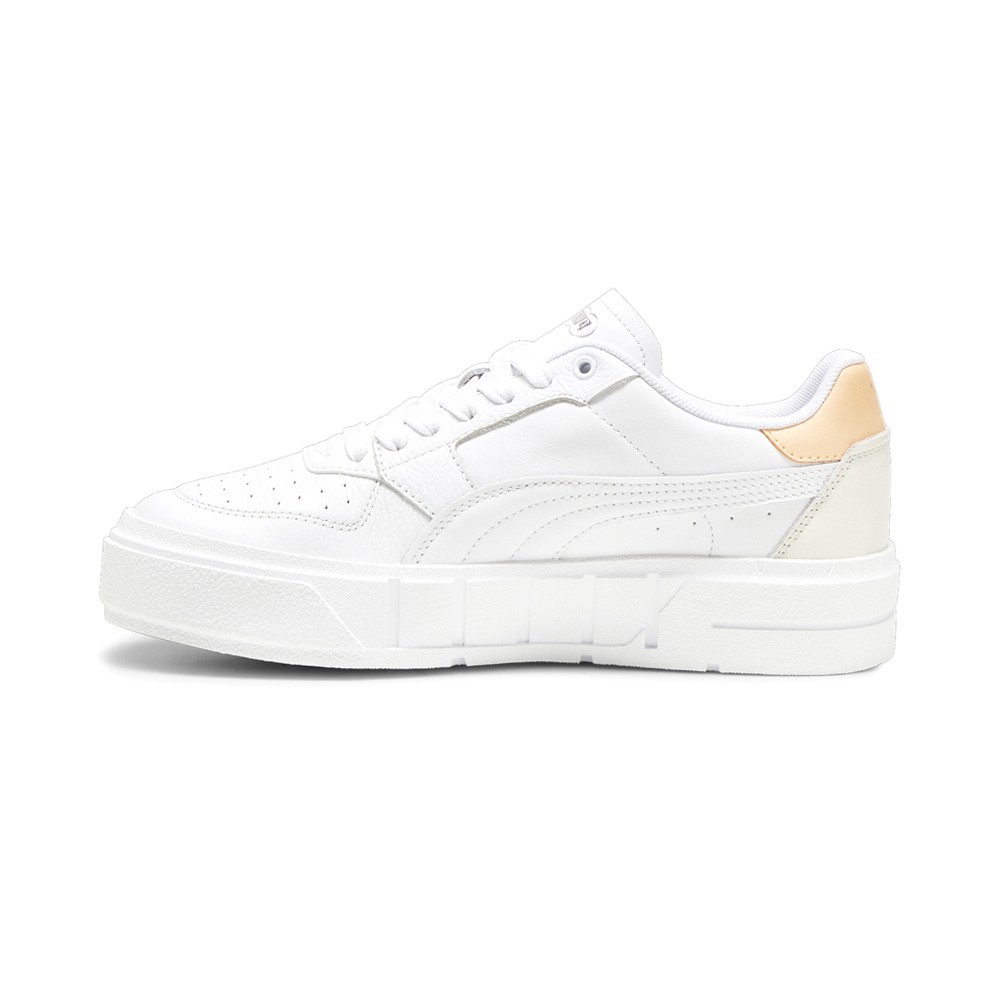 Cali Court Leather Lace Up Sneakers Product Details Leather upper Tumbled leather vamp, heel overlay and eyestay overlay Leather quarter panel, tongue and formstrip Perforated vamp and quarter panel details EVA midsole Color: Puma White/Peach Fizz Meet the PUMA Cali Court, your new favorite court classic. Standing at the intersection of sport, fashion, and streetwear, this sneaker brings the tennis vibes to any outfit and can be easily mixed and matched with other pieces to create an effortless look. This version features a full leather upper and fits in court side. Additional Details Manufacturer Color: Puma White/Peach Fizz Color: White Occasion: Casual Gender: Womens Age: Adult Brand: Puma