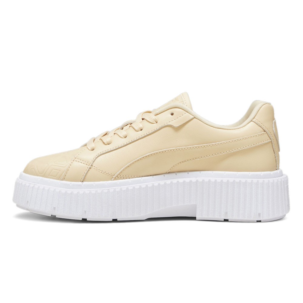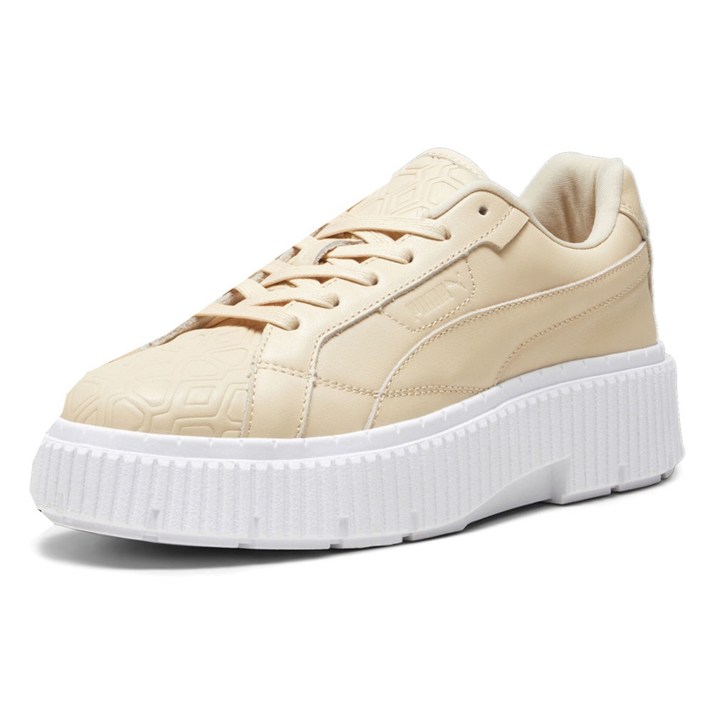Dinara Luxe Sport Lace Up Sneakers Product Details Soft leather base Soft leather vamp with debossed rudagon pattern Leather tongue with debossed rudagon pattern Rubber midsole Rubber outsole Color: Cashew The LUXE SPORT collection examines the intersection of sportswear and contemporary fashion through an acutely conceptual lens. Here, the Dinara brings a new, bolder and edgier point of view to our range of platform sneakers. This new silhouette centers around an archive related upper, complemented with a completely new look for the tooling. This execution features a soft leather upper with a heavy rudagon pattern debossed on the vamp and tongue. Additional Details Manufacturer Color: Cashew Color: Beige Occasion: Casual Gender: Womens Age: Adult Brand: Puma