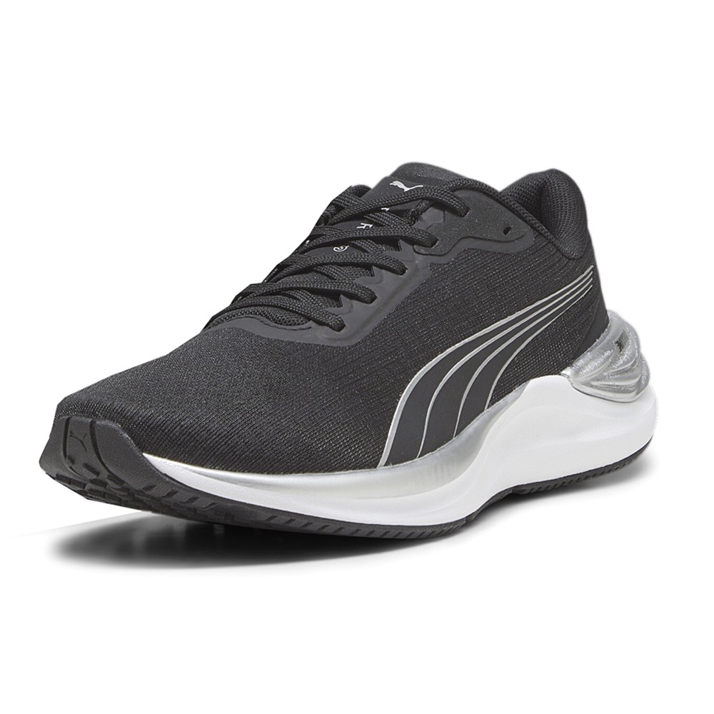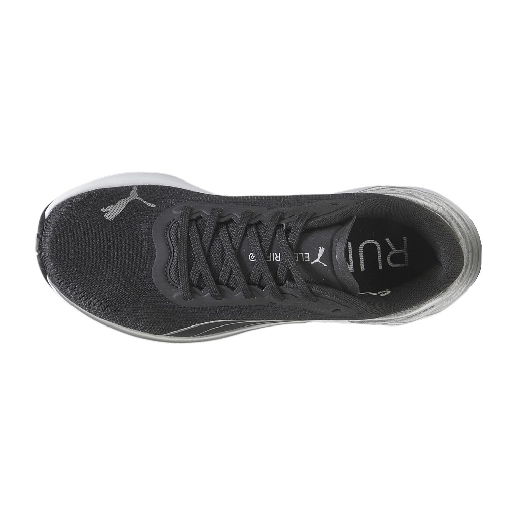 Electrify Nitro 3 Running Shoes Product Details Engineered mesh upper Thermoplastic Polyurethane heel spoiler Heel fit: rolled collar to keep the heel secure and comfortable Cushioning level: Medium PUMA Formstrip on the lateral side Color: Puma Black-Puma Silver The perfect choice for young runners, the Electrify NITRO 3 running shoe offers a progressive design, delivering cushioning and reliability for your daily jog. In a redesign of the previous models, this dual midsole has more NITRO in the heel and durable PROFOAMLITE throughout the rest of the midsole. The result is better responsiveness and ride under the foot, for a shoe that's always airy and cushioned. We’ve revamped the breathable mesh upper with a futuristic look and retooled the rest of the shoe with a rolled collar and a heel that will hug your foot. New female runners looking for good value: this is your shoe. Additional Details Manufacturer Color: Puma Black-Puma Silver Color: Black Occasion: Casual Gender: Womens Age: Adult Brand: Puma