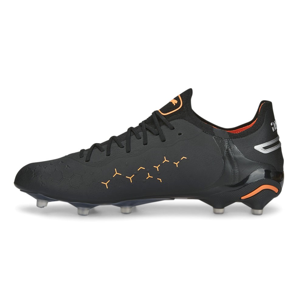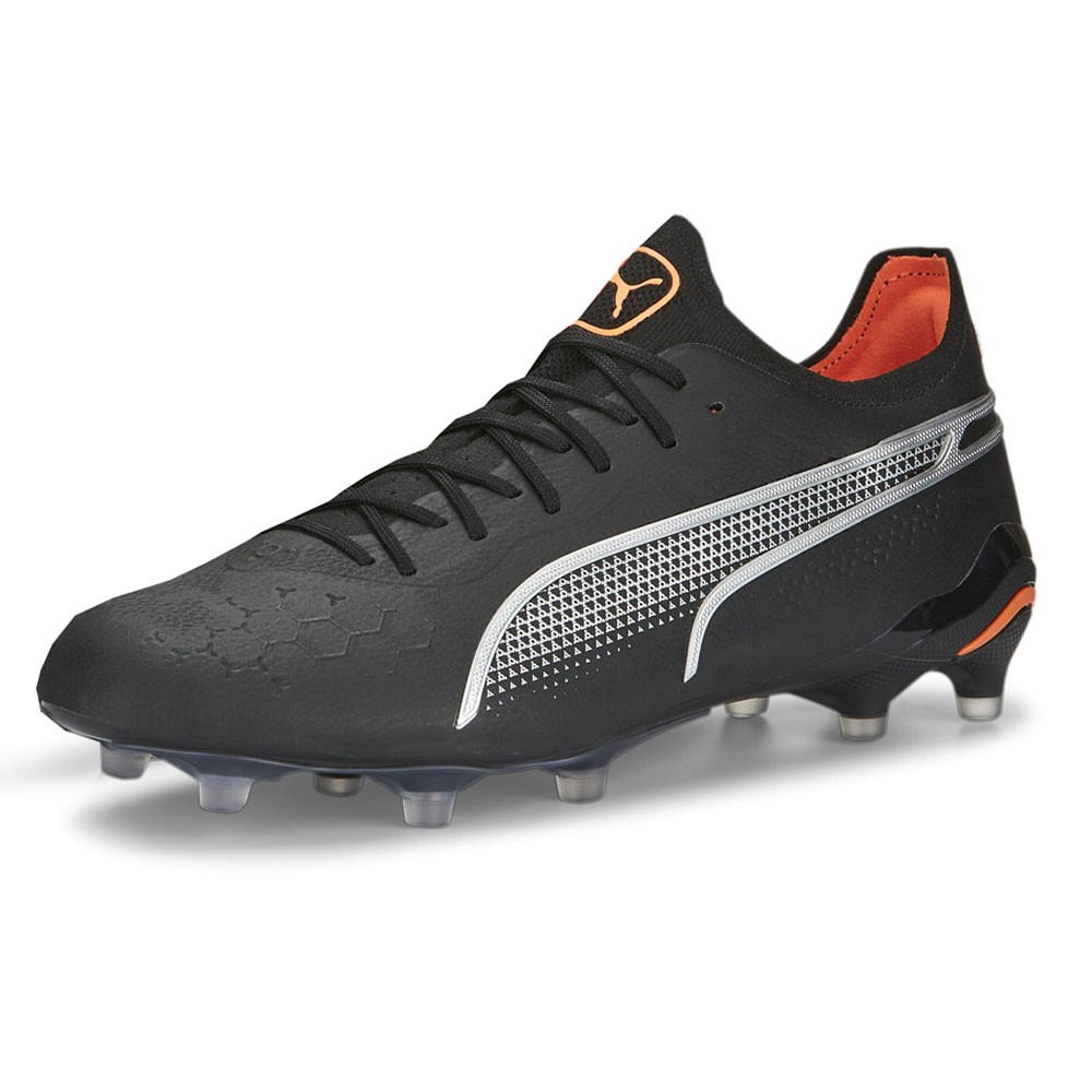 King Ultimate Soccer Cleats Product Details Lightweight outsole with external heel counter, integrated stability spine, and conical studs FG/AG: Firm ground/Artificial ground outsole Suitable for use on both firm natural surfaces and artificial grass (4G) PUMA Formstrip on the lateral vamp Color: Puma Black-Silver-Ultra Orange Control never felt this comfortable. An icon that spans generations, the KING is back with bold design upgrades and innovative materials that work better – for the player and for the planet. Like the all-new K-BETTER upper material, made with recycled content to reduce environmental impact while improving the signature touch, comfort, and stretch resistance. The new lightweight outsole features an external heel counter, integrated stability spine, and conical studs, so you have as much control over your movement as you do over the ball. Additional Details Manufacturer Color: Puma Black-Silver-Ultra Orange Color: Black Occasion: Casual Gender: Mens Age: Adult Brand: Puma