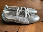 The PUMA Speedcat Ballet Metallic Silver Shoes in Women's Size 8.5 US are a stylish and sleek athletic sneaker designed for women. Featuring a metallic silver color and leather upper material, these shoes combine comfort and fashion in a sporty package. Includes Authenticity certificate from GOAT.