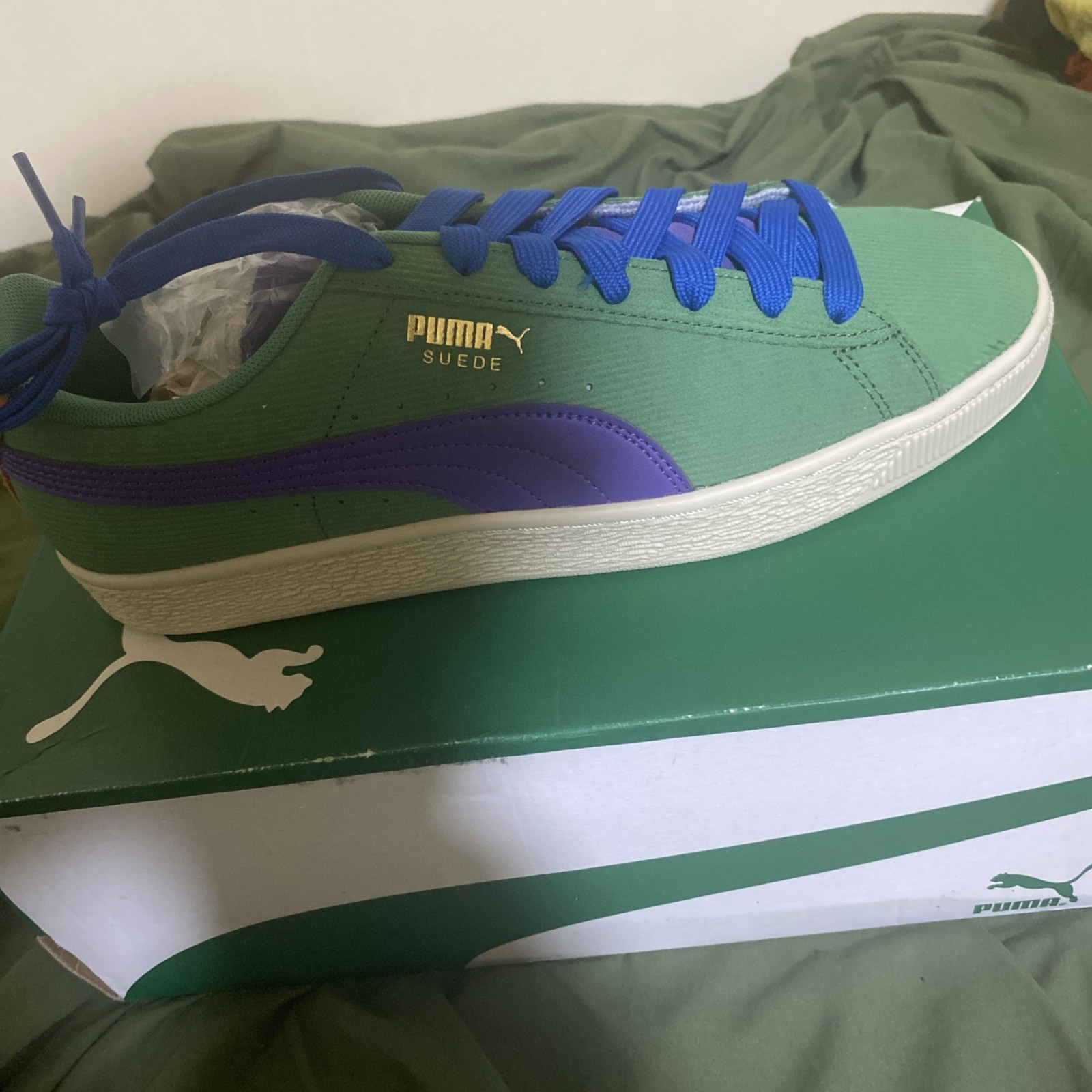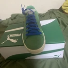 The PUMA Suede Cord is a stylish and classic sneaker designed for men, featuring a unique corduroy upper material in a rich green color. This athletic shoe from the PUMA Suede product line combines comfort and style, making it a versatile choice for everyday wear. The shoe is finished with archive green, team violet, and rickie orange accents, adding a pop of color to the design. With a US shoe size of 10, this PUMA Suede model is sure to make a statement with its sleek silhouette and iconic branding.