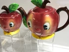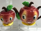 Cute smiling teapot and sugar bowl made by Py Miyao in Japan in the fifties.Teapot is excellent. No chips, cracks or repairs.The sugar bowl has 3 tiny glaze chips on yellow collar and a few tiny ones inside rim of apple.