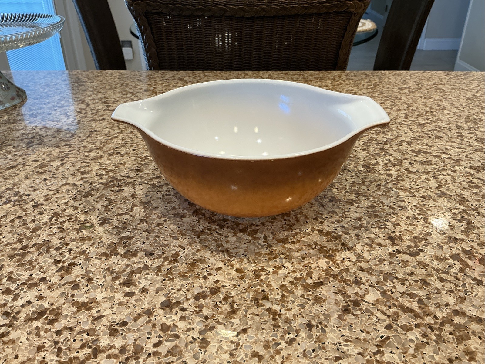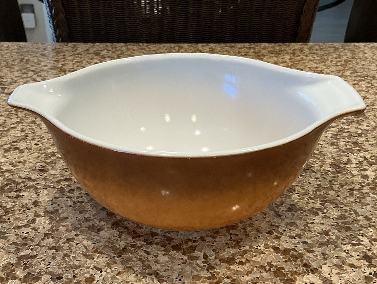 Embrace the charm of the kitchen classics with the Pyrex Old Orchard Cinderella Mixing Bowl. This piece, model 442, boasts a lovely copper brown variegated hue with a vintage pattern that evokes the timeless elegance of mid-century modern design. Ideal for all occasions, it is a functional and decorative addition to any table or collection. Crafted in the United States during the 1970s this 1 1/2 quart milk glass bowl is a testament to the quality and style of the era. It features a stackable design for efficient storage and is oven safe for versatility in use. Whether for mixing, serving, or display, this original piece brings a hint of nostalgia to your home. This piece is in very good condition, no chips, there are 2 marks in the bowl, not scratches where it removed the paint, but rather from being stacked. This is featured in the pictures.