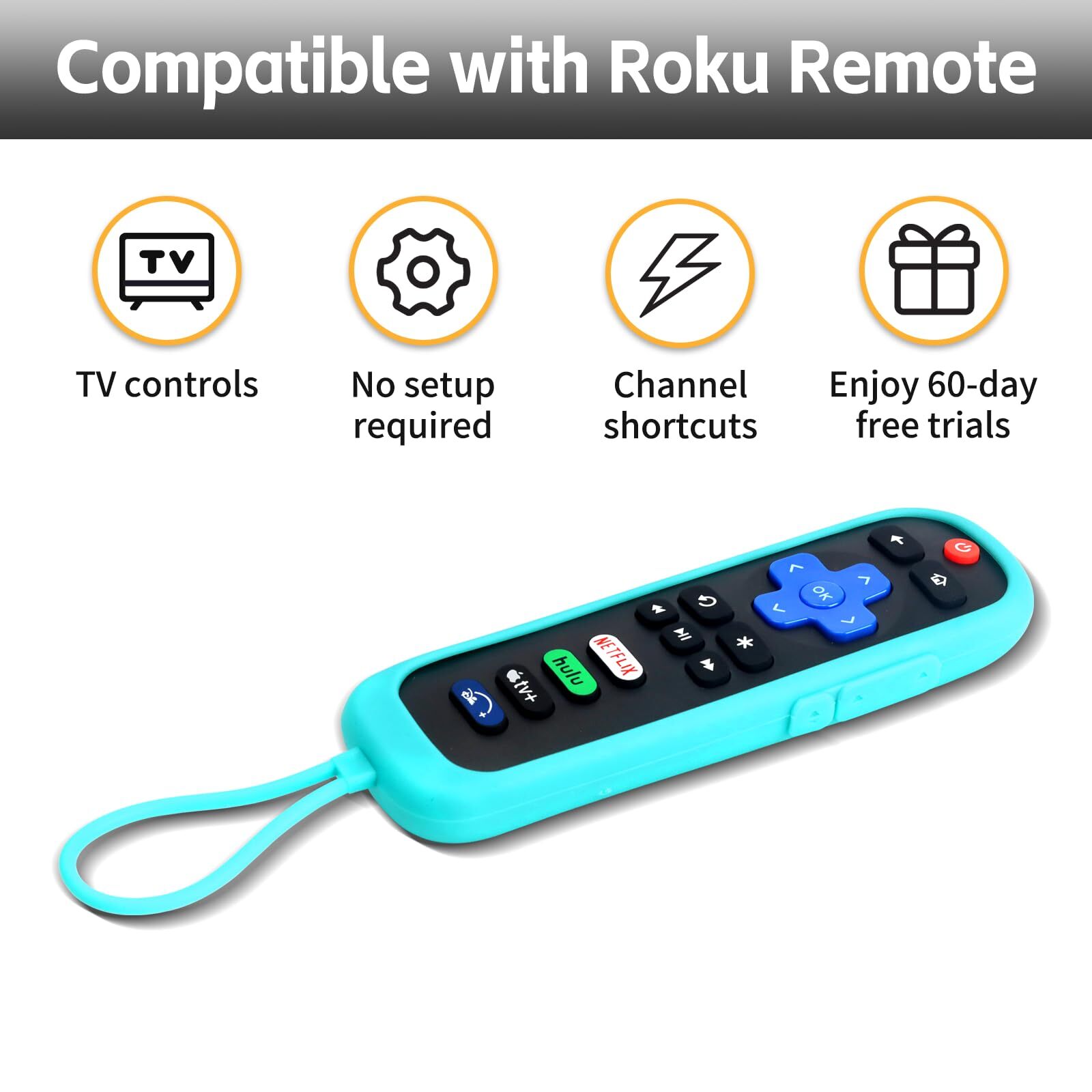【Pack of 2】 Universal Remote for Roku TV, Replacement Remote Compatible for TCL Features: 【Wide Compatibility】 This remote is designed exclusively for Roku TVs and is not compatible with Roku Sticks, Roku Streaming Sticks, Roku Boxes (1/2/3/4 HD/LT/XS/XD), Roku Ultra, Roku Express, Roku Premiere, or Roku Players. 【Convenient Shortcut Buttons】The universal TV remote features 4 handy shortcut buttons for quickly accessing your favorite channels, making it an ideal replacement for your old or damaged smart TV remote for Roku. 【Comfortable Material】Crafted from high-quality ABS plastic and silicone, this remote is comfortable and strong. The soft, responsive buttons ensure easy navigation and control. It offers an extended transmitting distance of over 25 feet, a quick response time of 0.3 seconds. 【Soft Protective Case】Comes with 2 soft silicone case, which designed with high-quality anti-slip texture, anti-lost rope, and signal window, comfortable to grip, and it can protect your remote from dropping. 【Works Right Out of the Box】No programming or setup is required to use our remote; insert two AAA batteries (not included), and it's ready to go. The remote offers a seamless user experience. Features: 【Wide Compatibility】 This remote is designed exclusively for Roku TVs and is not compatible with Roku Sticks, Roku Streaming Sticks, Roku Boxes (1/2/3/4 HD/LT/XS/XD), Roku Ultra, Roku Express, Roku Premiere, or Roku Players. 【Convenient Shortcut Buttons】The universal TV remote features 4 handy shortcut buttons for quickly accessing your favorite channels, making it an ideal replacement for your old or damaged smart TV remote for Roku. 【Comfortable Material】Crafted from high-quality ABS plastic and silicone, this remote is comfortable and strong. The soft, responsive buttons ensure easy navigation and control. It offers an extended transmitting distance of over 25 feet, a quick response time of 0.3 seconds. 【Soft Protective Case】Comes with 2 soft silicone case, which designed with high-quality anti-slip texture, anti-lost rope, and signal window, comfortable to grip, and it can protect your remote from dropping. 【Works Right Out of the Box】No programming or setup is required to use our remote; insert two AAA batteries (not included), and it's ready to go. The remote offers a seamless user experience. eBay integration by